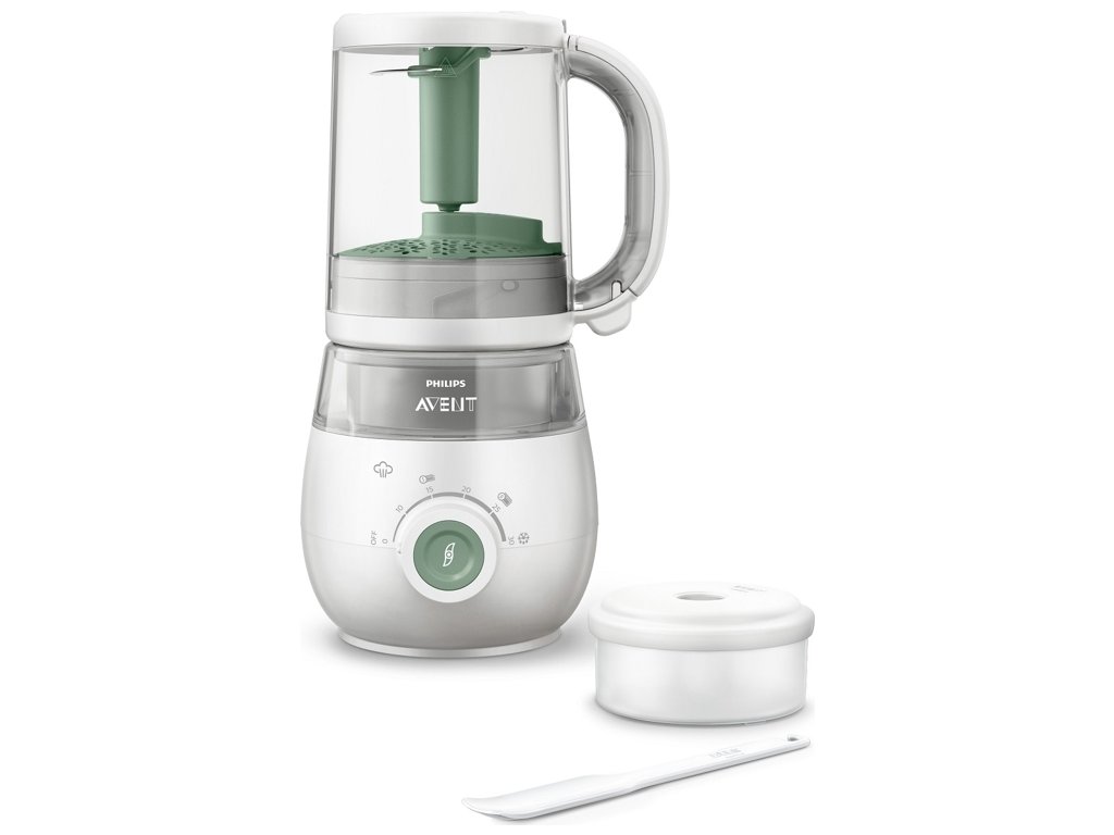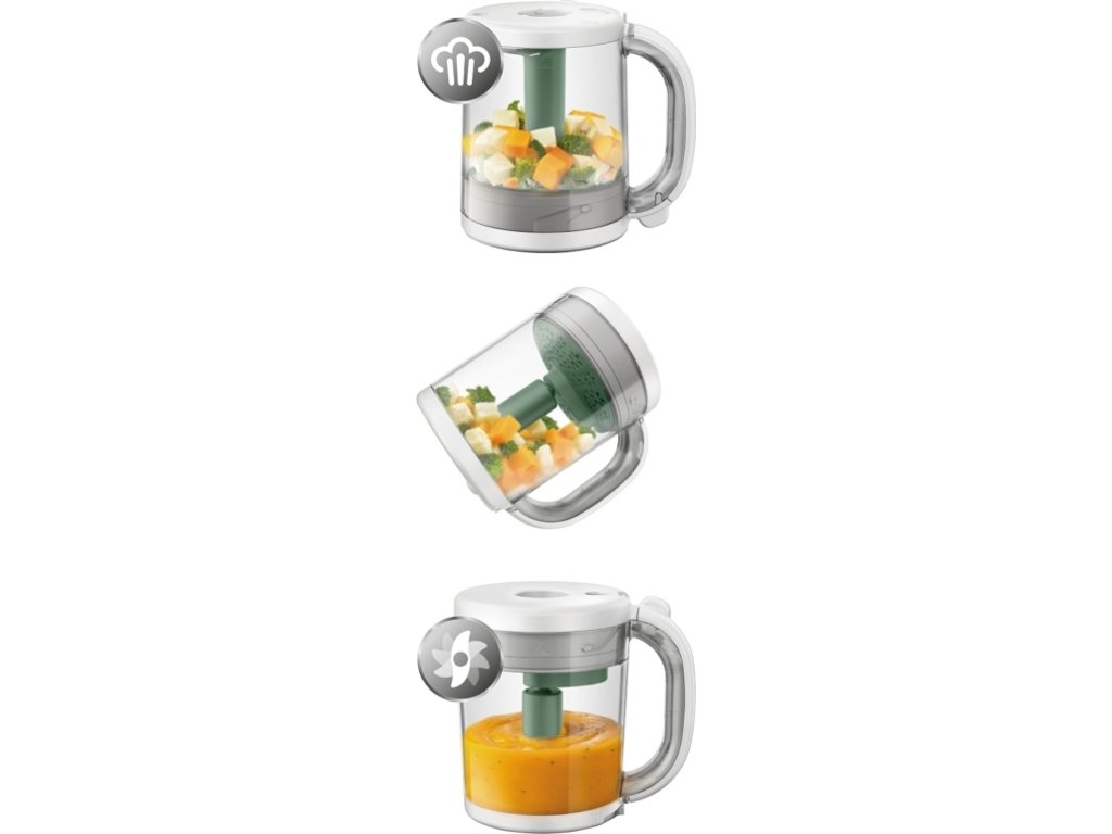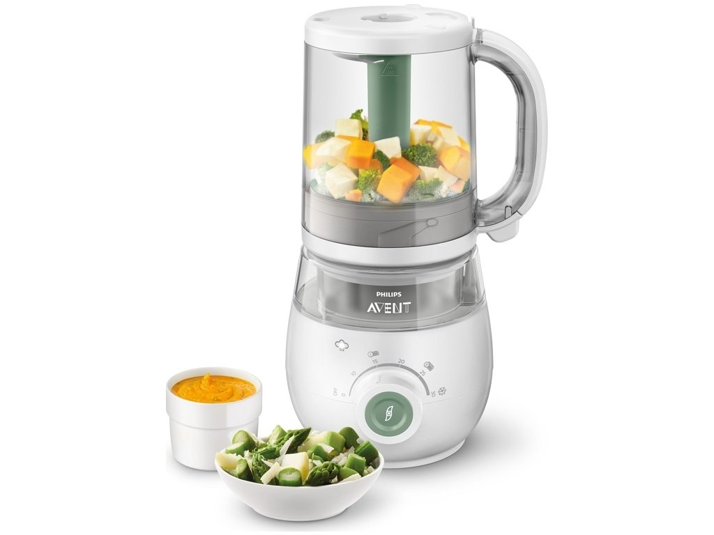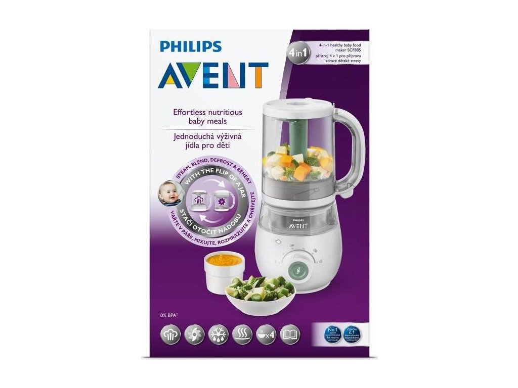 AVENT Parní hrnec a mixér 4v1 pro přípravu zdravé dětské stravy. Jednoduchá výživná jídla pro děti - stačí otočit nádobu - **vařte v páře, mixujte, rozmrazujte a ohřívejte** - jedinečné provedení 4 v 1. **Více jídel najednou** - uvařte až 4 jídla naráz s 1 000 ml nádobou. Jedinečná technologie páry - **vaření v páře** představuje zdravý způsob přípravy potravin. Unikátní technologie umožňuje páře proudit zespodu nahoru, čímž je zajištěna rovnoměrná tepelná úprava ingrediencí bez vaření. Vařte v páře, míchejte a mixujte - **vše potřebné k přípravě výživné dětské stravy v jediné nádobě**. Až budou ingredience podušené, stačí jen odklopit víko nádoby, otočit ho a upevnit v obrácené poloze. Poté už vše jen rozmixujte na požadovanou konzistenci. **Strava pro jakoukoli fázi odstavení** - tento přístroj 4 v 1 pro přípravu zdravé dětské stravy **zvládá každý krok procesu mixování od velmi jemně rozmixovaného ovoce a zeleniny, přes míchání přísad, po vytvoření směsi s malými kousky**. **Snadné čistění** - nádobu a ostří lze mýt v myčce na nádobí a nádržka na vodu je snadno přístupná. **Chutné a výživné recepty** - chutné recepty pro přechod na tuhou stravu od Dr. Emmy Williamsové. Stáhněte a objevte víc - objevte zdravé recepty, zábavná videa a tipy a triky.