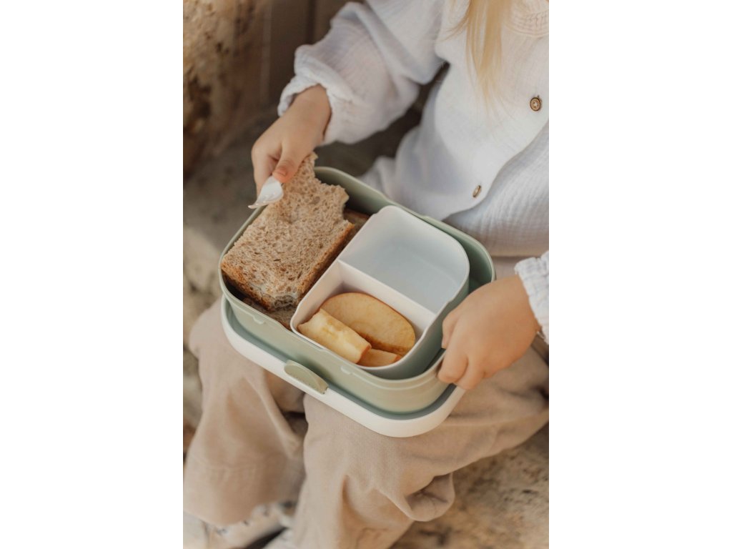 Praktický svačinový box nabízí možnost rozdělení na tři přihrádky pro oddělení jednotlivých částí uložené svačinky. Součástí boxu je i malá vidlička, která je ideální pro napichování kousků ovoce či zeleniny. Zacvakávací uzávěr je zárukou bezpečného uzavření obsahu boxu.