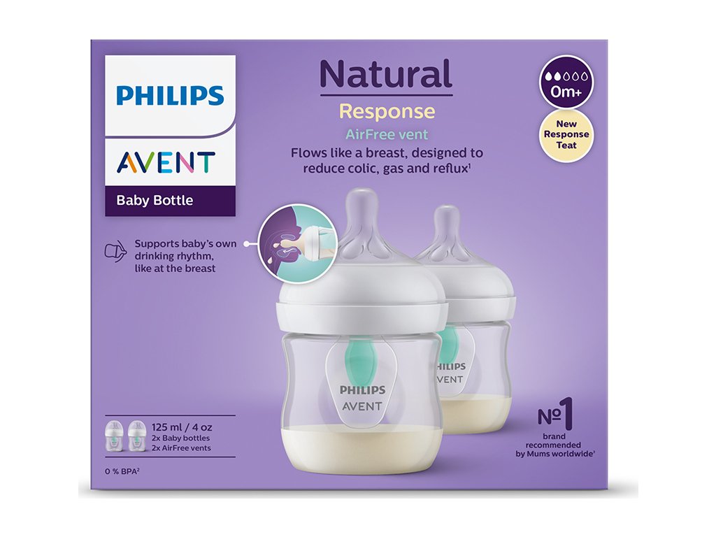 - Zajišťuje klidné, pohodlné krmení. Dudlík Natural Response podporuje přirozený rytmus sání, polykání a dýchání dítěte a ventil AirFree je navržen tak, aby odváděl vzduch z láhve, a chránil tak proti kolice, plynatosti a refluxu.