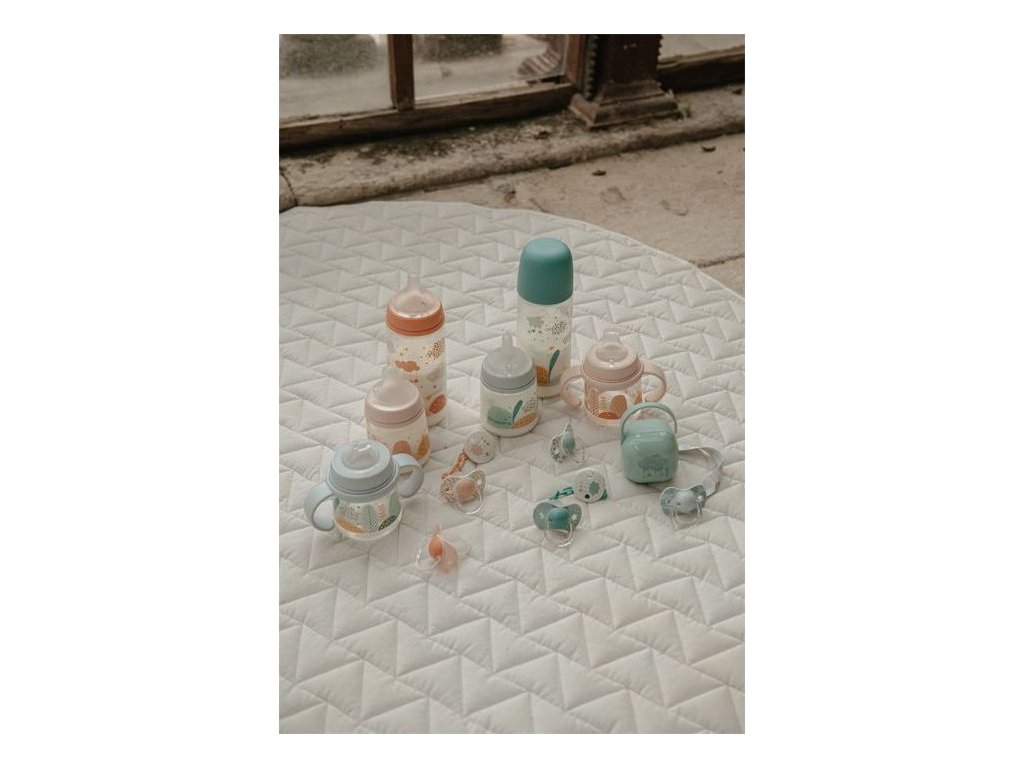 Druhá láhev s oušky se speciální SX ProTM antikolikovou savičkou usnadňuje přechod z kojenecké láhve na pití z hrníčku či sklenice. Silikonové pítko je měkké a materiálově shodné se savičkami kojeneckých lahví a dudlíků SX ProTM . Proto ho Vaše děti přijmou rychleji než běžná tvrdá pítka.