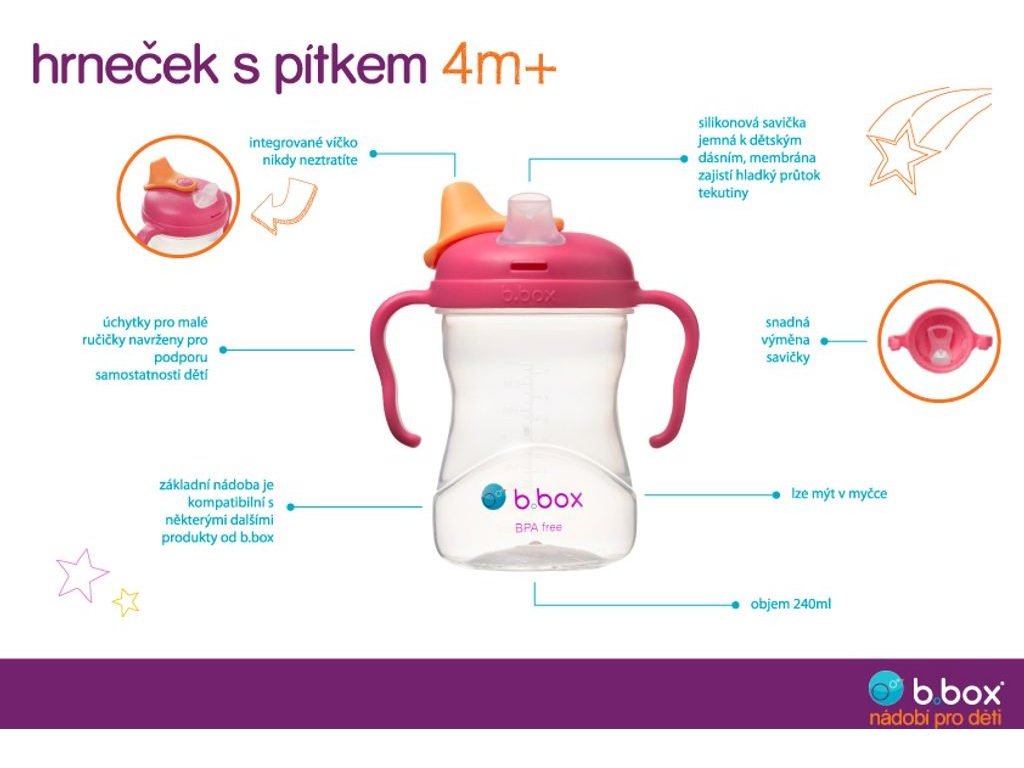 Oblíbená australská značka b.box nabízí skvělou startovací sadu na pití pro nejmenší děti. Sada na pití obsahuje 3 různé hrnečky v 1 a provede vaše miminko od první lahvičky až do batolecího věku. Jednoduše vyměňte víčko na hrnečku a můžete zkoušet, co dítěti nejvíce vyhovuje!