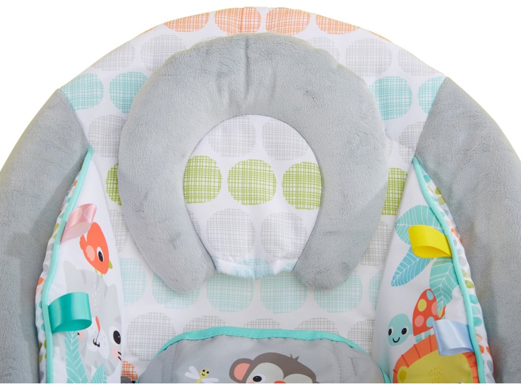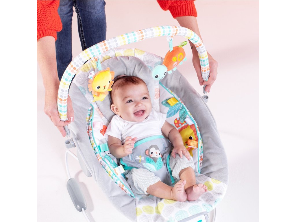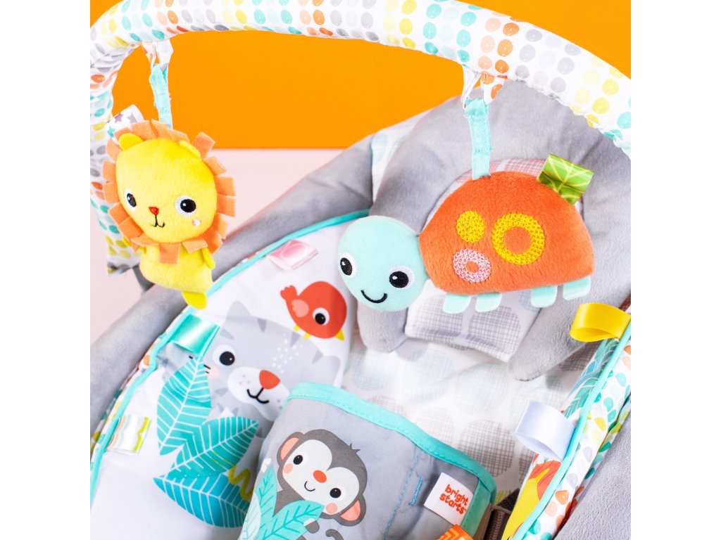Zábava je na prvním místě! Lehátko Whimsical Wild od Bright Starts bude rozveselovat miminko v jednom kuse. Pohodlná sedací část poskytuje perfektní pohodlí a podporu s uklidňujícími vibracemi, plyšovými tkaninami, integrovanou novorozeneckou vložkou a odnímatelnou opěrkou hlavy. Barevné a poutavé postavičky dělají toto lehátko zábavným! Miminko bude milovat uklidňující pocity z barevných saténových stužek Taggies. Lehátko nabízí 7 příjemných melodií a automatické vypnutí po 15 minutách. Hrazdička je jednoduše odnímatelná jednou rukou, pro snadný přístup k miminku. Nastavitelný 3-bodový bezpečnostní pás bude celý čas ochraňovat váš poklad.