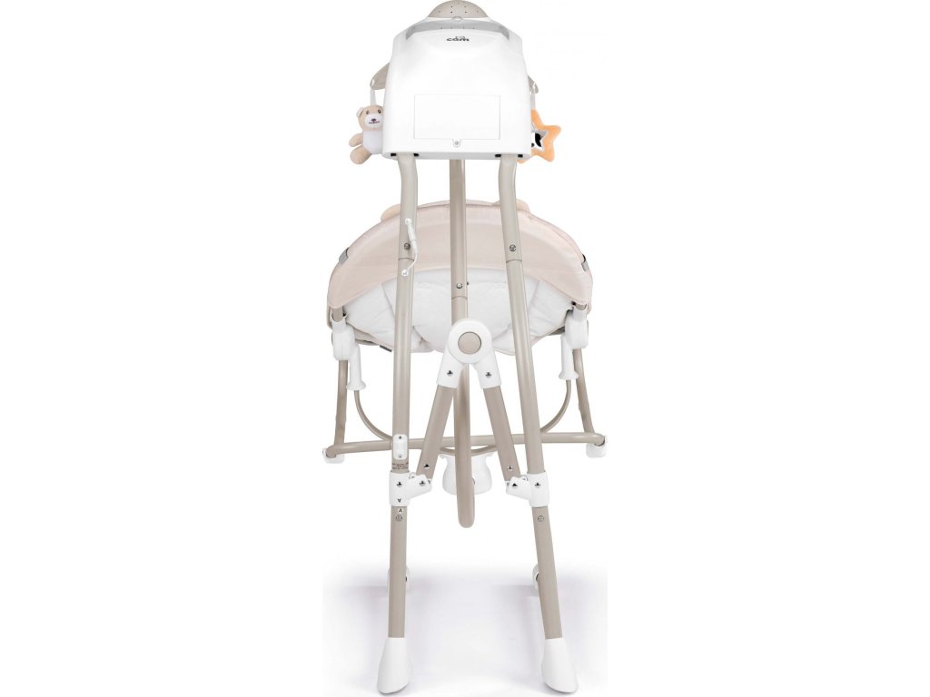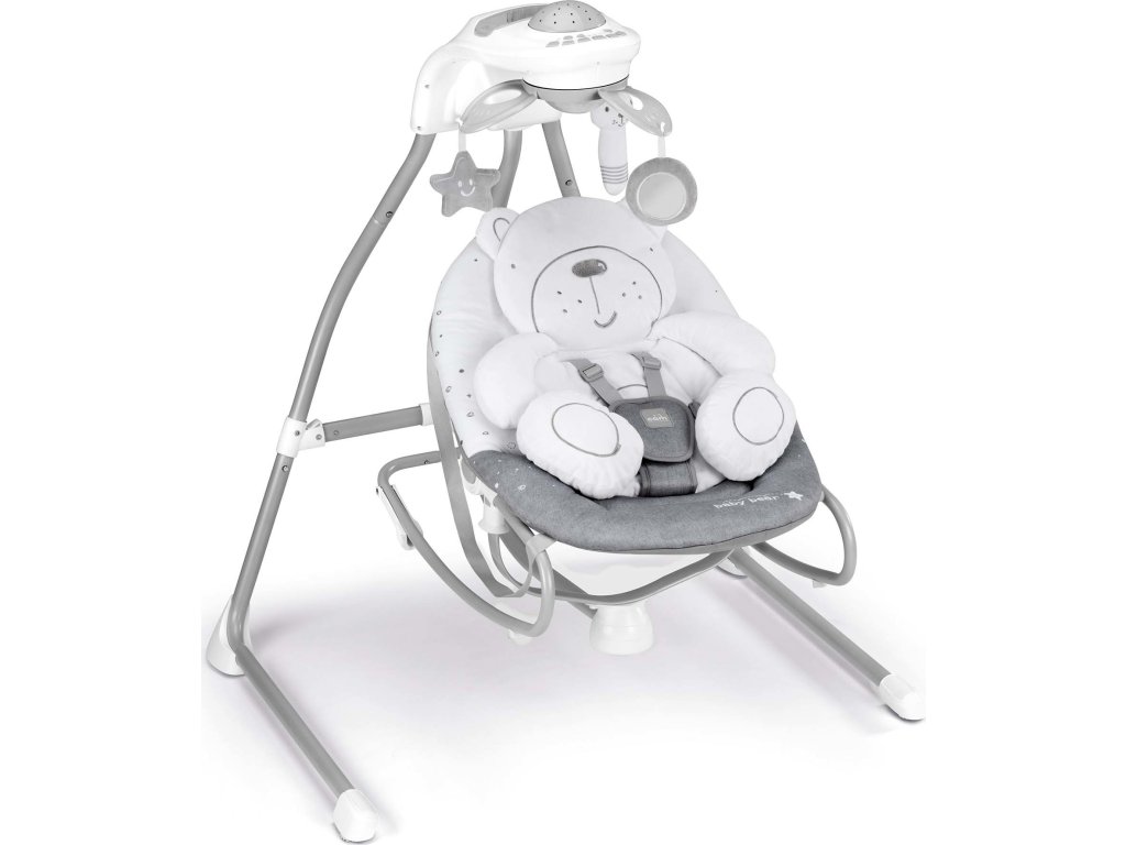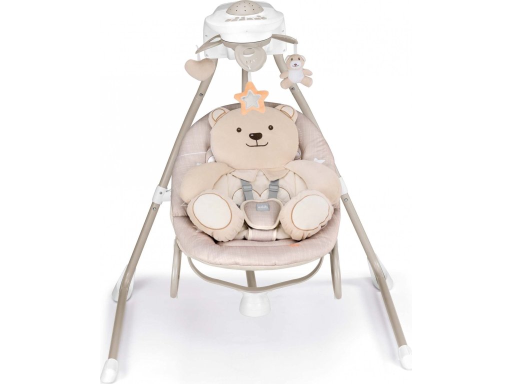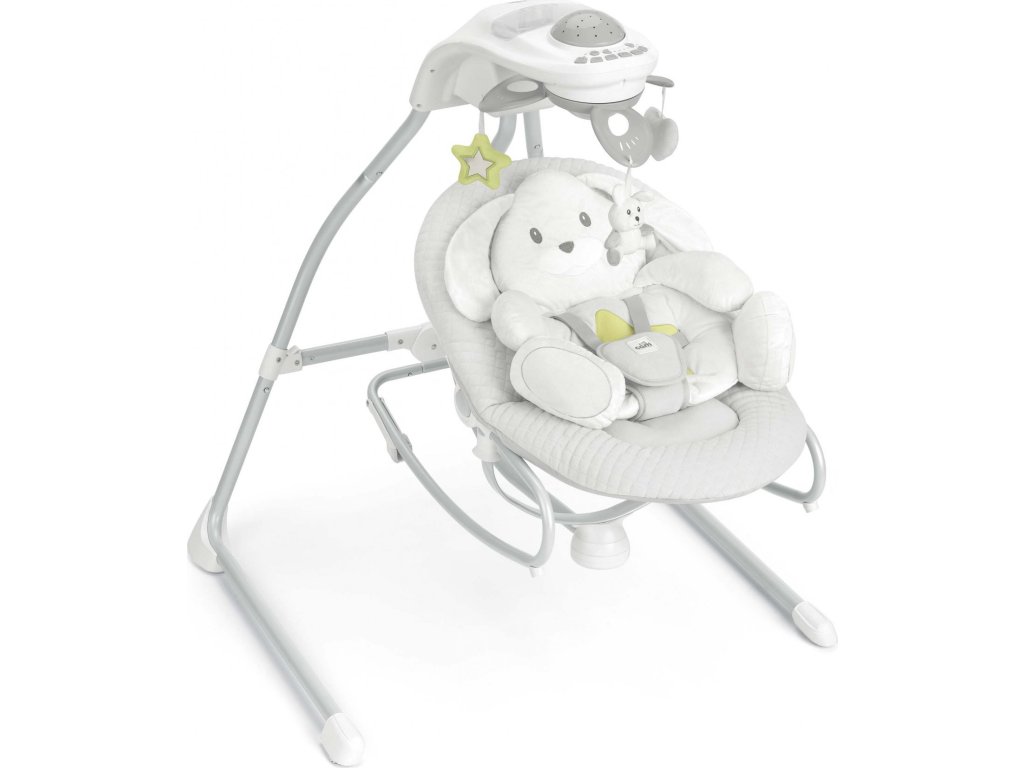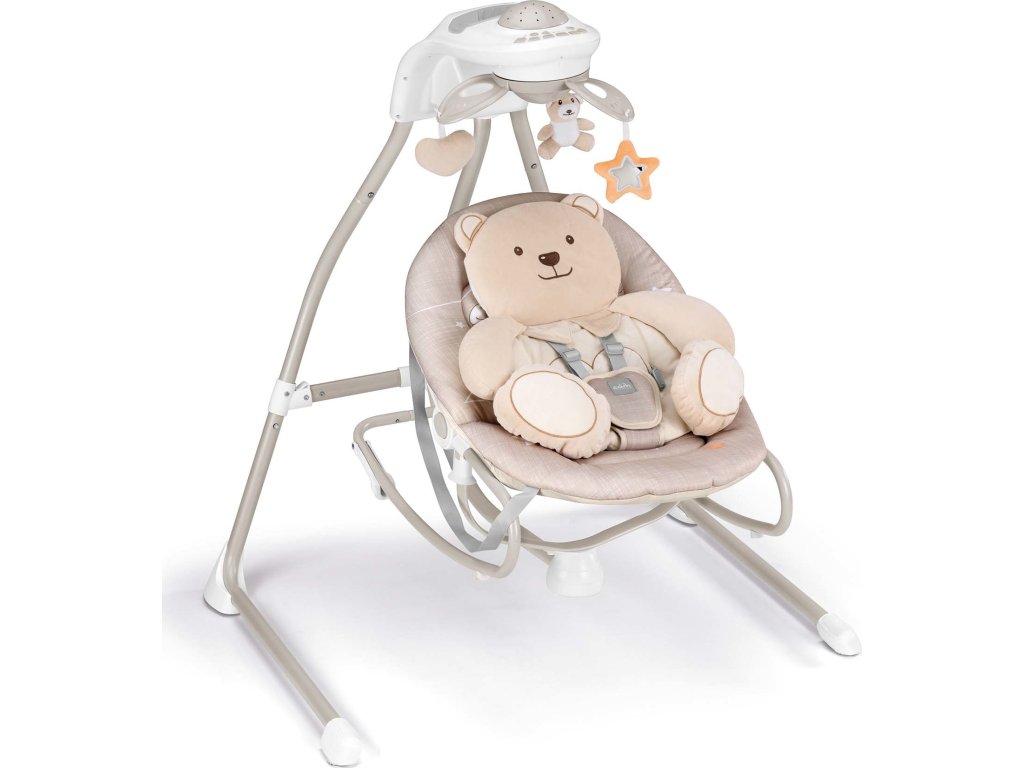 Na "dvojnožce" je možné dítě kolébat nebo se děťátko, když je větší může houpat samo. Zabaví se i kolotočem s plyšovými zvířátky a jemná měnitelná hudba ho uklidní.