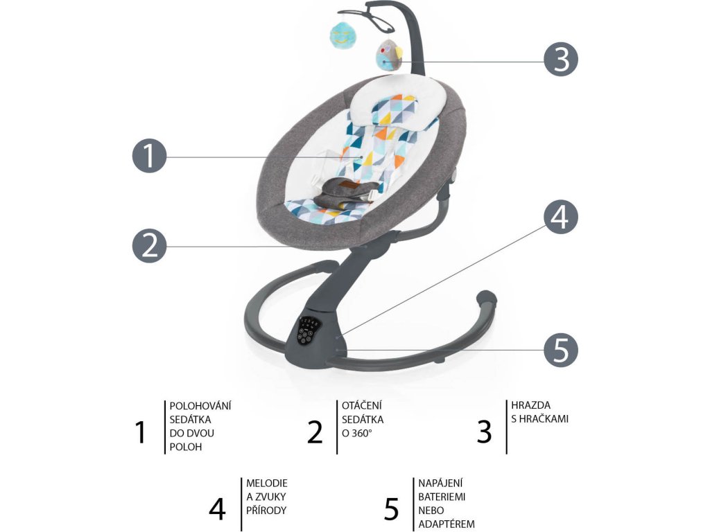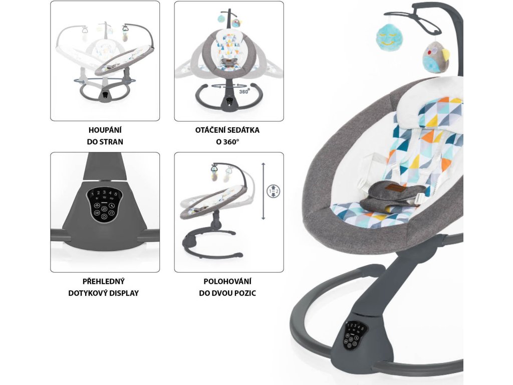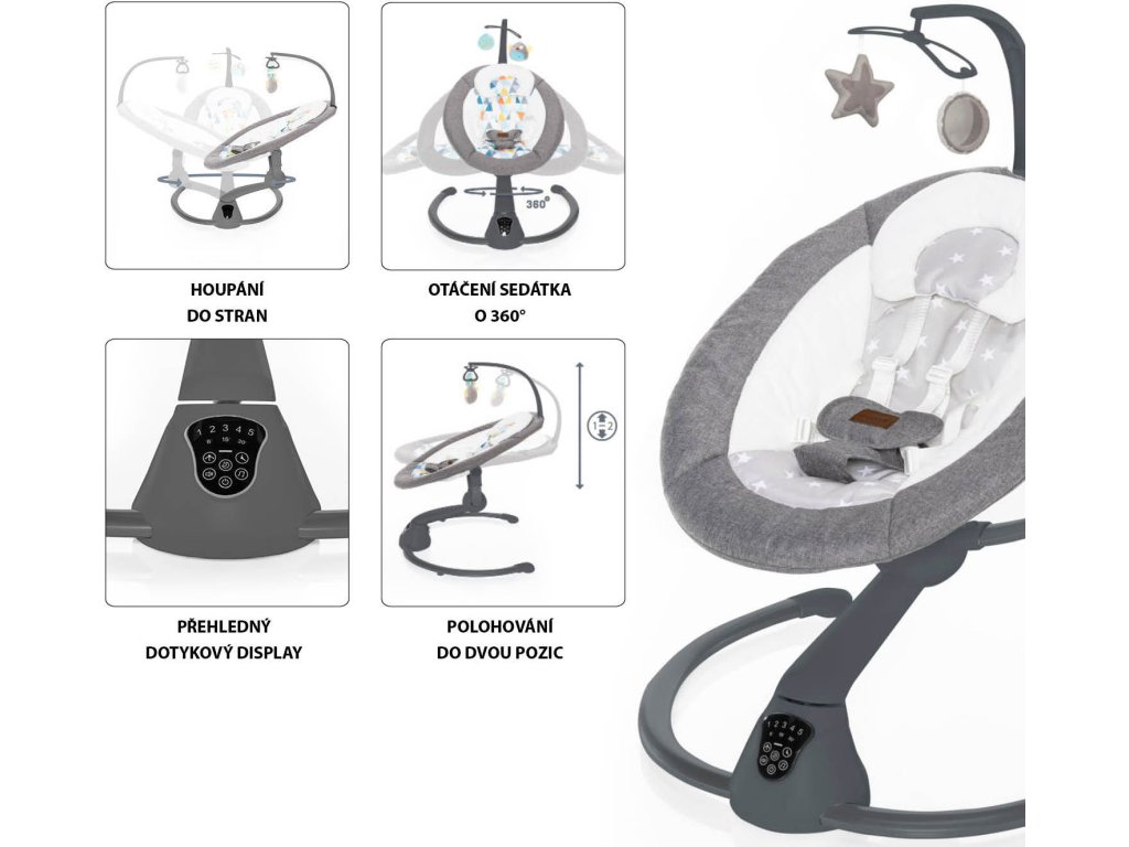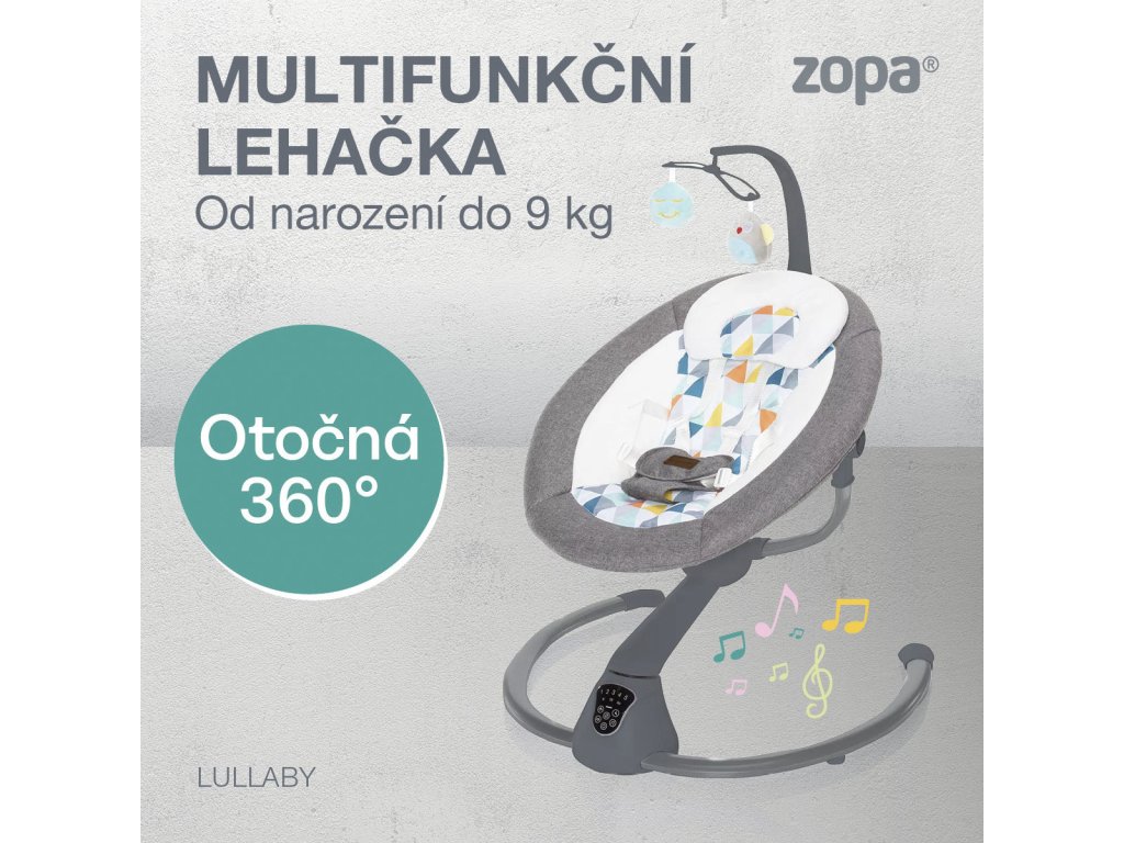 Otáčení o 360°, 5 stupňů intenzity houpání, automatické zapnutí, nastavení doby houpání, dotykový ovládací panel, dálkový ovladač, hrazda s hračkami, 5 bodový bezpečnostní pás, zvuky pro uklidnění – to je multifunkční lehačka Lullaby. Vhodná pro děti od narození do 9 kg.