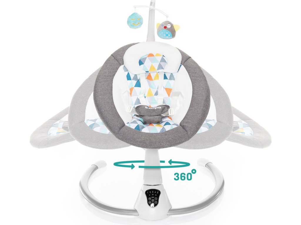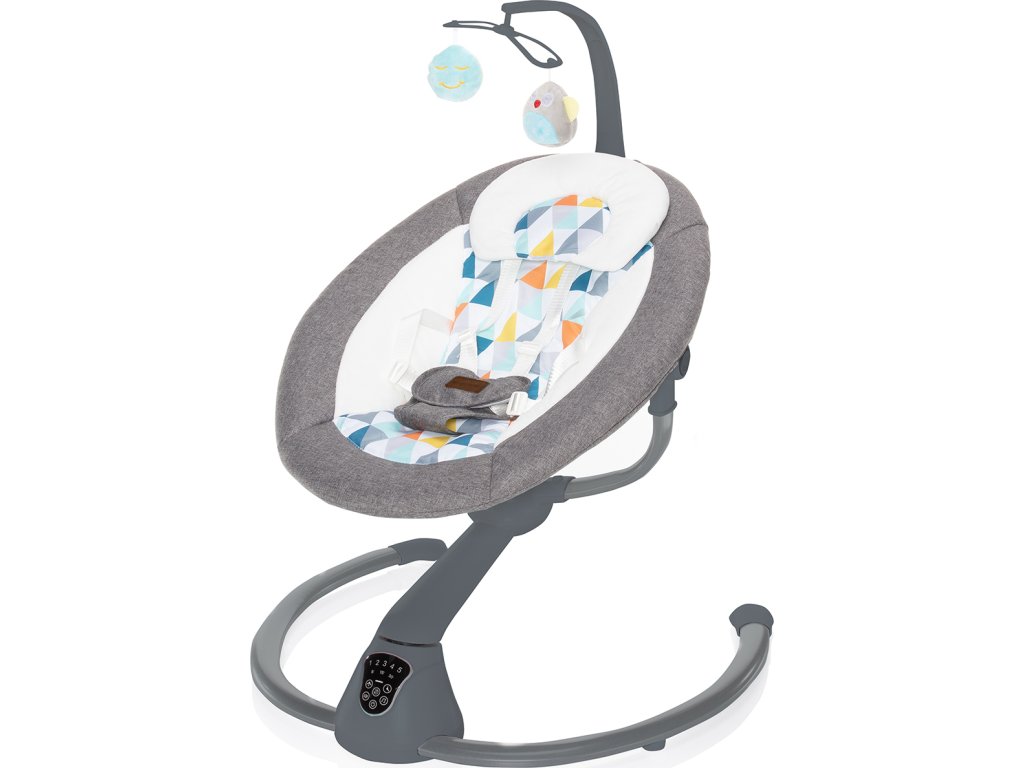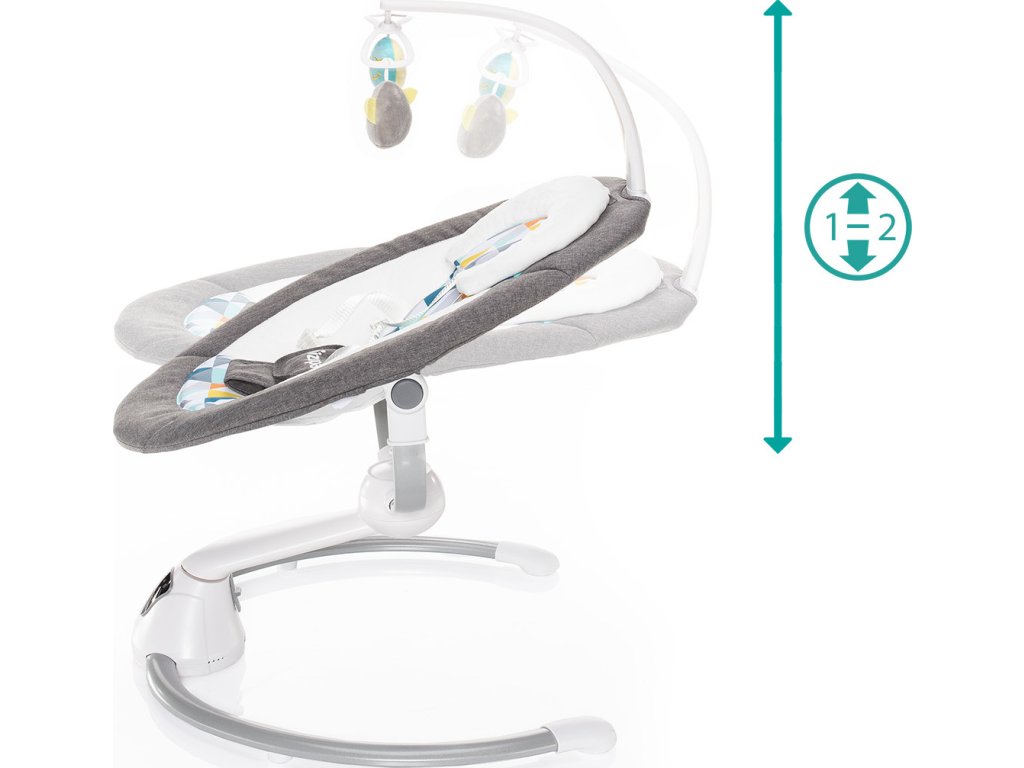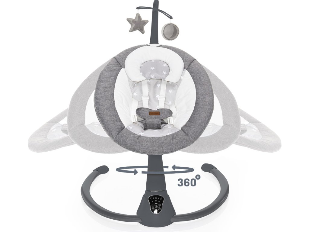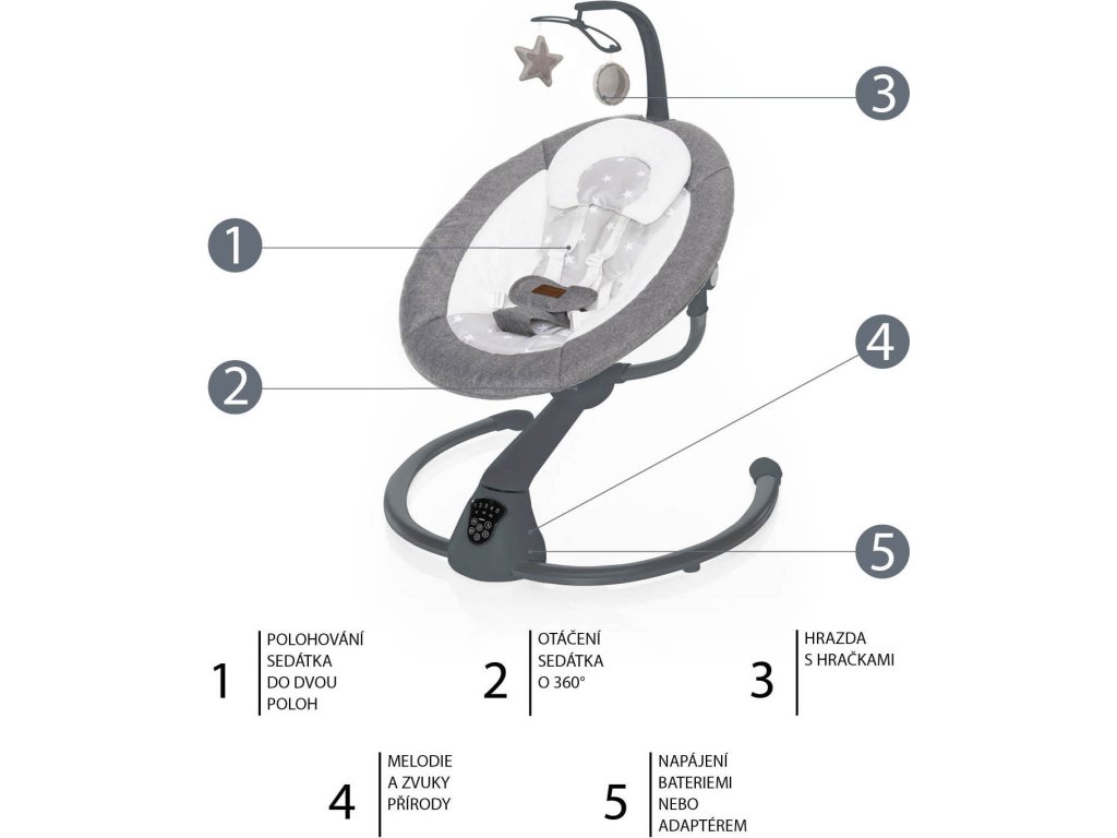 Otáčení o 360°, 5 stupňů intenzity houpání, automatické zapnutí, nastavení doby houpání, dotykový ovládací panel, dálkový ovladač, hrazda s hračkami, 5 bodový bezpečnostní pás, zvuky pro uklidnění – to je multifunkční lehačka Lullaby. Vhodná pro děti od narození do 9 kg.