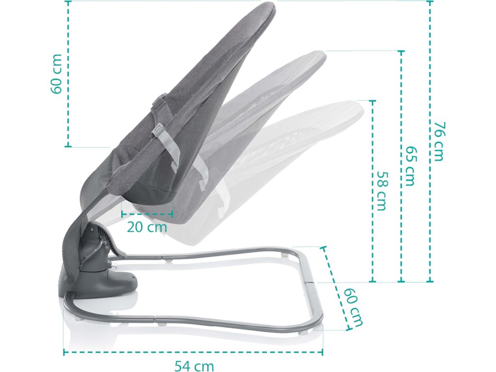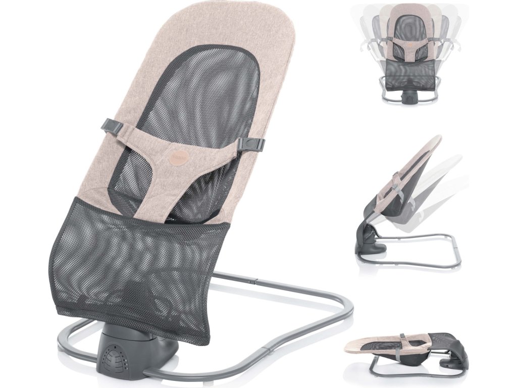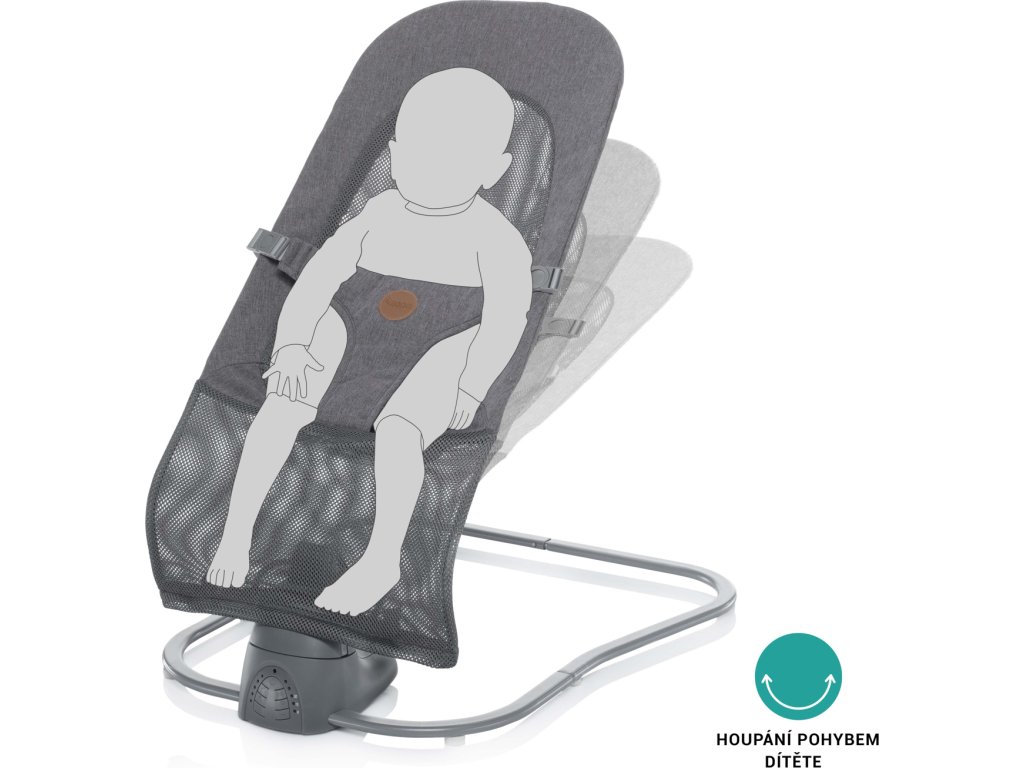 Pevná kovová konstrukce poskytuje oporu a stabilitu pro děti od narození až do 9 kg. Moderní čistý design doplňuje středová část, která je tvořena odolnou síťkou. Ta umožňuje proudění vzduchu k dítěti a reguluje tak teplotu miminka. Lehačka je dostupná ve dvou barevných variantách – šedobéžové a šedé. Lehce tak zapadne do jakéhokoliv interiéru, aniž by jej narušila výraznými barvami. Součástí jsou pevné popruhy pošité měkkou látkou, které zajistí bezpečí dítěte při houpání.