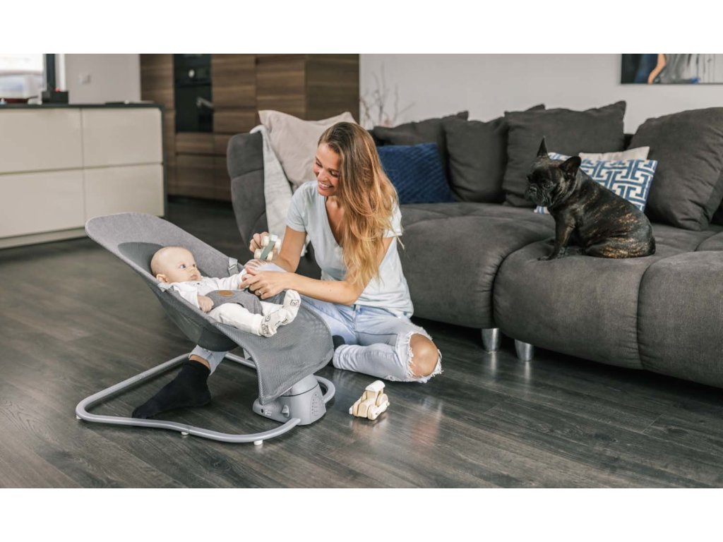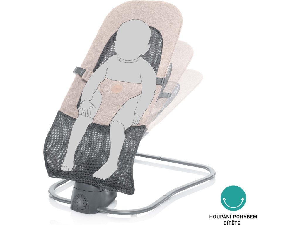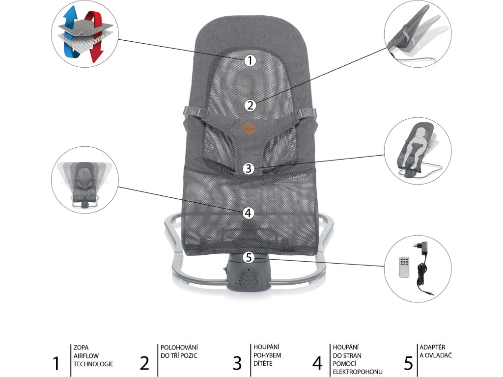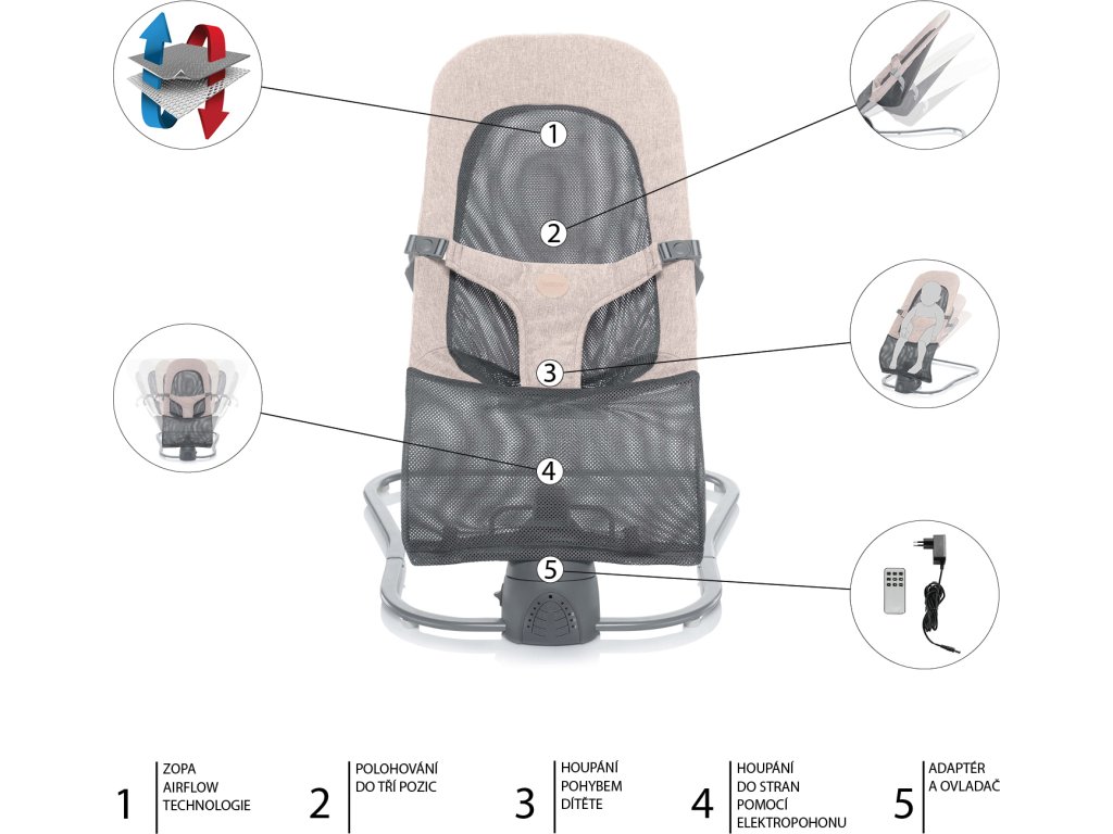 Zádová opěrka je polohovatelná do 3 poloh podle toho, zda chce miminko pozorovat svět kolem sebe, nebo spíše pospávat. Systém houpání je zajištěn dvěma způsoby – první je nezávislý na elektrické energii, kdy se lehačka rozhoupe pohyby dítěte, druhý je pak pomocí elektropohonu, který lehačku rozhoupe do stran. Elektrické houpání má 5 druhů intenzity, které lze libovolně volit podle toho, co je dítěti nejpříjemnější. Napájení je řešeno pomocí adaptéru, který se dodává v balení. Lehačka také obsahuje sloty na AAA baterie, takže lehačku můžete vzít sebou na cesty i tam, kde není dosah elektrických sítí. Součástí je také časovač s intervaly 8,15 a 30 minut. Užitečnou funkcí je automatické zapnutí, které se aktivuje ihned, když lehačka zaznamená pohyb dítěte. Všechny funkce lze ovládat přes panel v přední části nebo lze využít dálkový ovladač, který je součástí balení.