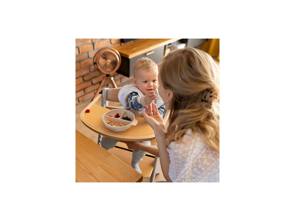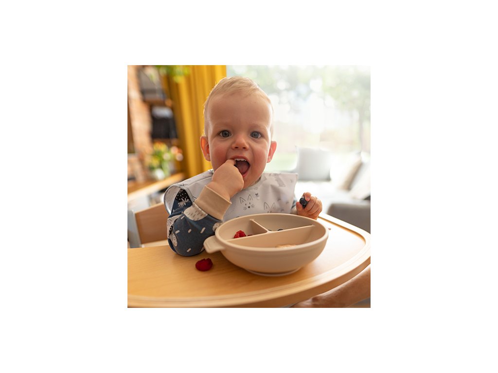 Zavádíte do jídelníčku svého miminka tuhé jídlo nebo zkoušíte metodu BLW? Tento silikonový talířek se třemi přihrádkami vám to výrazně usnadní. Umožní dítěti ochutnávat nové chutě, podporuje samostatné krmení a díky přísavce udrží talíř pevně na místě – bez rizika převrácení. Víčko udrží jídlo teplé a čerstvé, takže můžete připravit jídlo předem nebo uschovat zbytky později. Tři samostatné přihrádky umožňují servírovat různé druhy jídel bez míchání chutí. Zaoblené okraje a vyšší stěny usnadňují nabírání jídla, ať už rukou nebo příborem. Talíř i víčko jsou vyrobeny z odolného, netoxického silikonu bez BPA, který můžete používat v mikrovlnné troubě i myčce na nádobí.