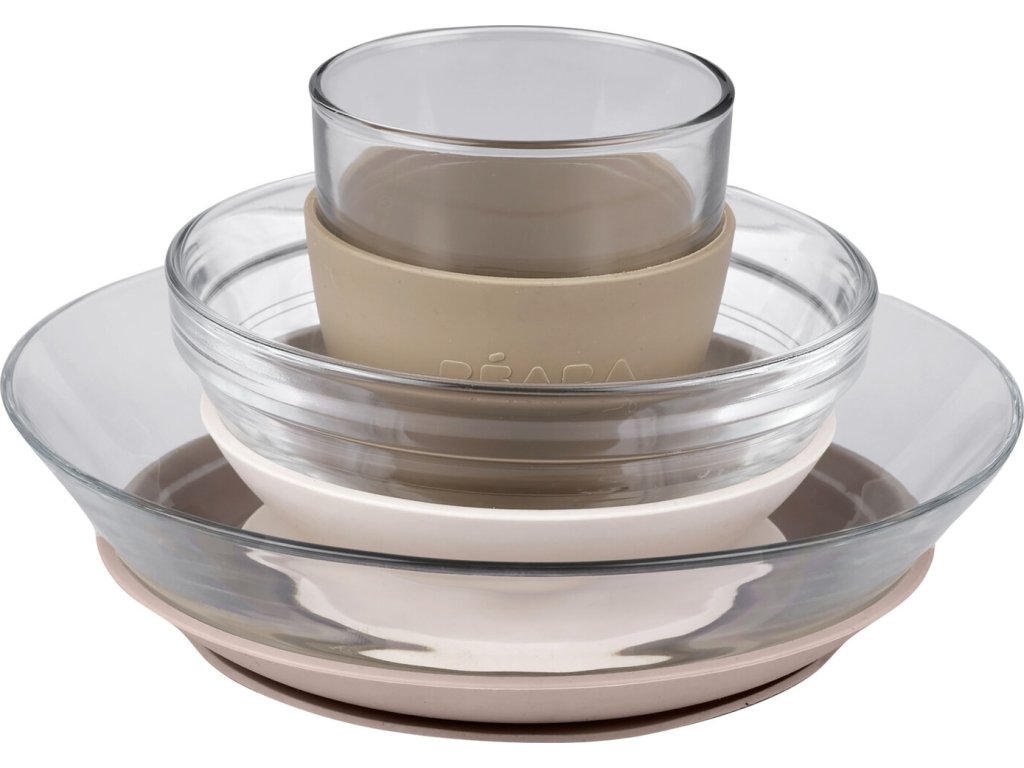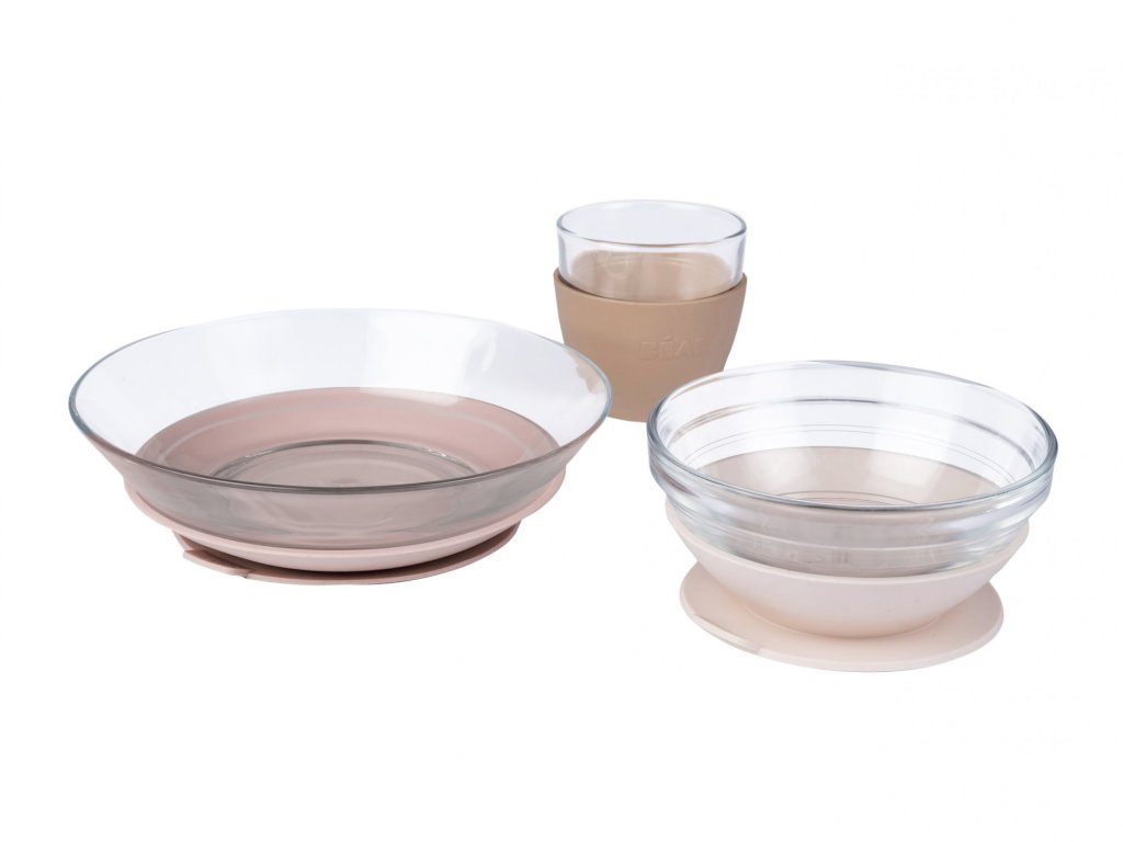 Unikátní sadu nádobí z tvrzeného skla tvoří jídelní miska, talířek a sklenička ergonomického, zaobleného tvaru s hladkými hranami. Miska a talíř jsou doplněny speciálními odnímatelnými podložkami z pružného materiálu s přísavkou, která zajišťuje stabilitu misky či talíře na stole a usnadňuje dítěti stolování. Návlek na skleničku ze stejného materiálu usnadňuje dítěti uchopení skleničky a snižuje riziko jejího vyklouznutí z ruky.