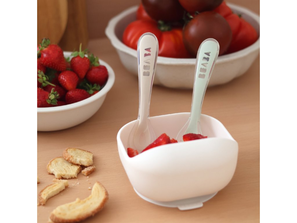 Silikonová lžička pro první samostatné krmení má ideální tvar pro dětská ústa. Tvar držadla usnadňuje dítěti držení lžičky. Integrovaná opěrka lžičky zabraňuje při položení lžičky na stůl kontaktu jídla se stolem a zajišťuje tak čistotu a hygienu. Praktické pouzdro umožňuje hygienické přenášení lžiček např. v přebalovací tašce.
