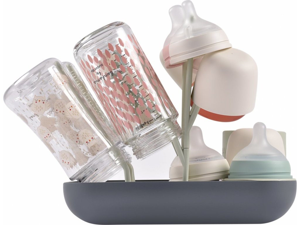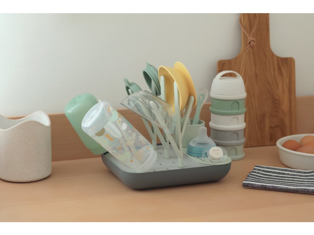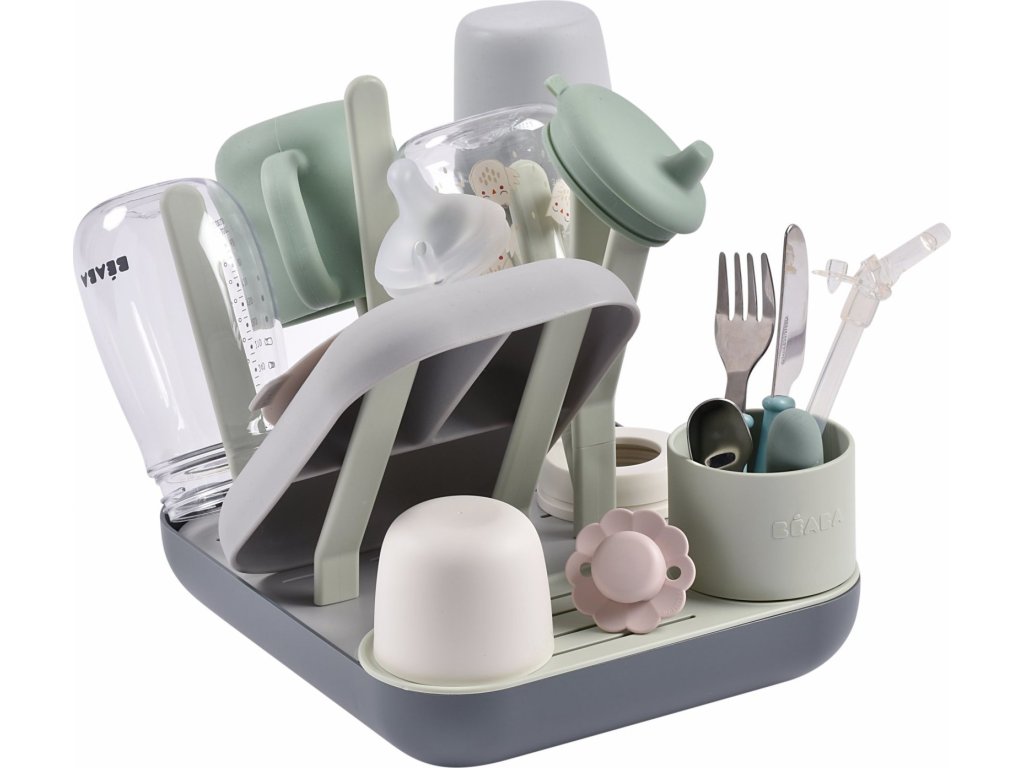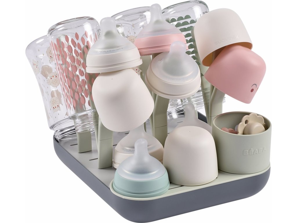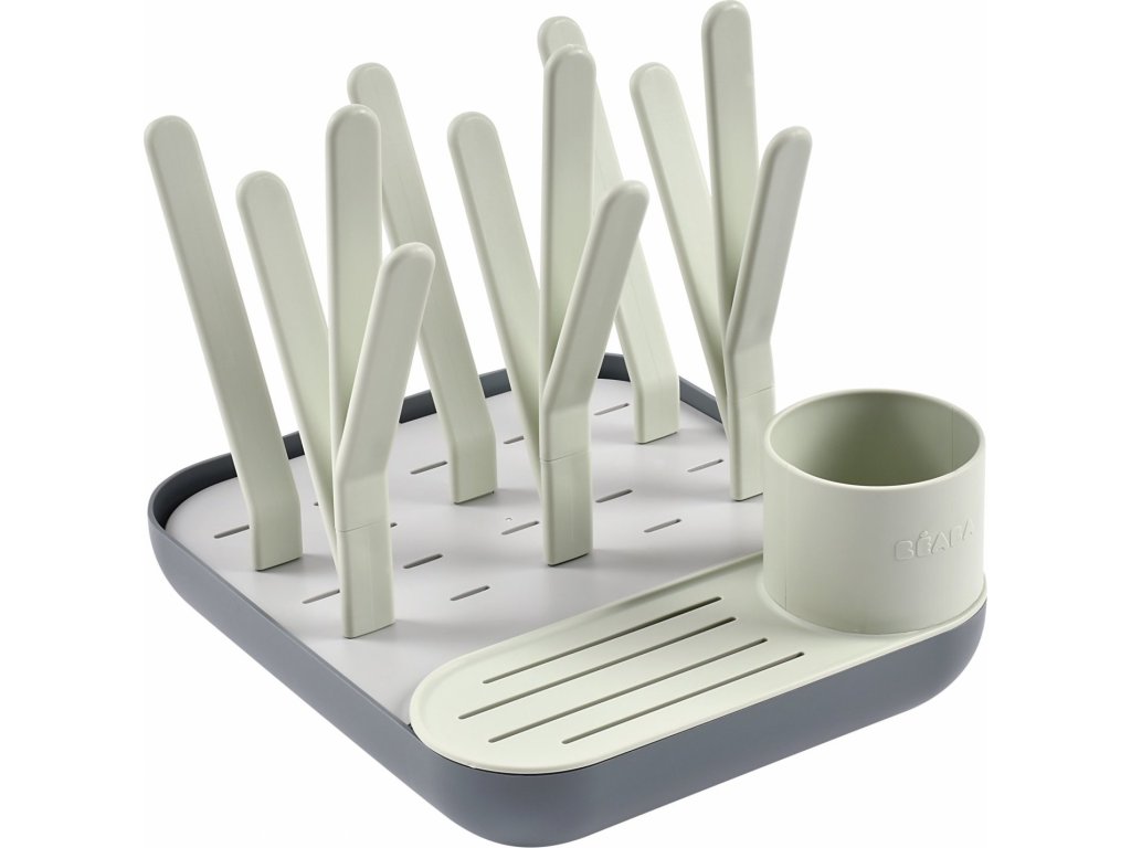 Variabilní stojan Beaba na sušení kojeneckých lahví, hrnků, misek, lžiček a doplňků. Stojan má vyjímatelné držáky a umožňuje tak přizpůsobit jeho uspořádání dle typu a velikosti nádobí, které na stojan potřebujete umístit. Odnímatelná základna usnadňuje údržbu stojanu a zároveň slouží pro uložení jednotlivých součástí stojanu, když jej právě nepoužíváte.
