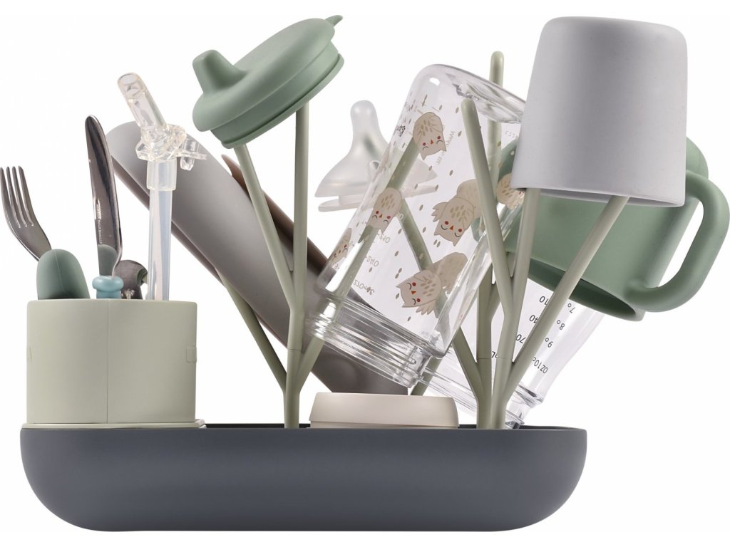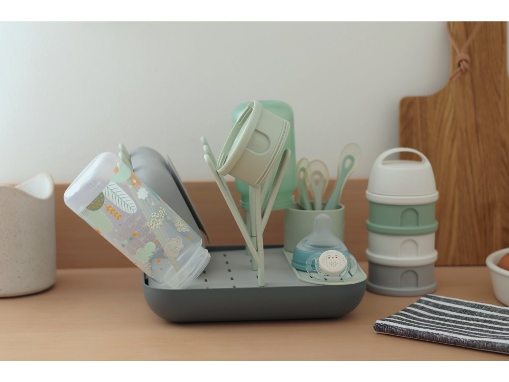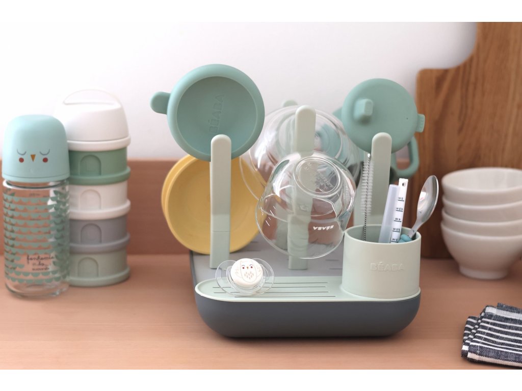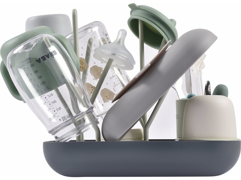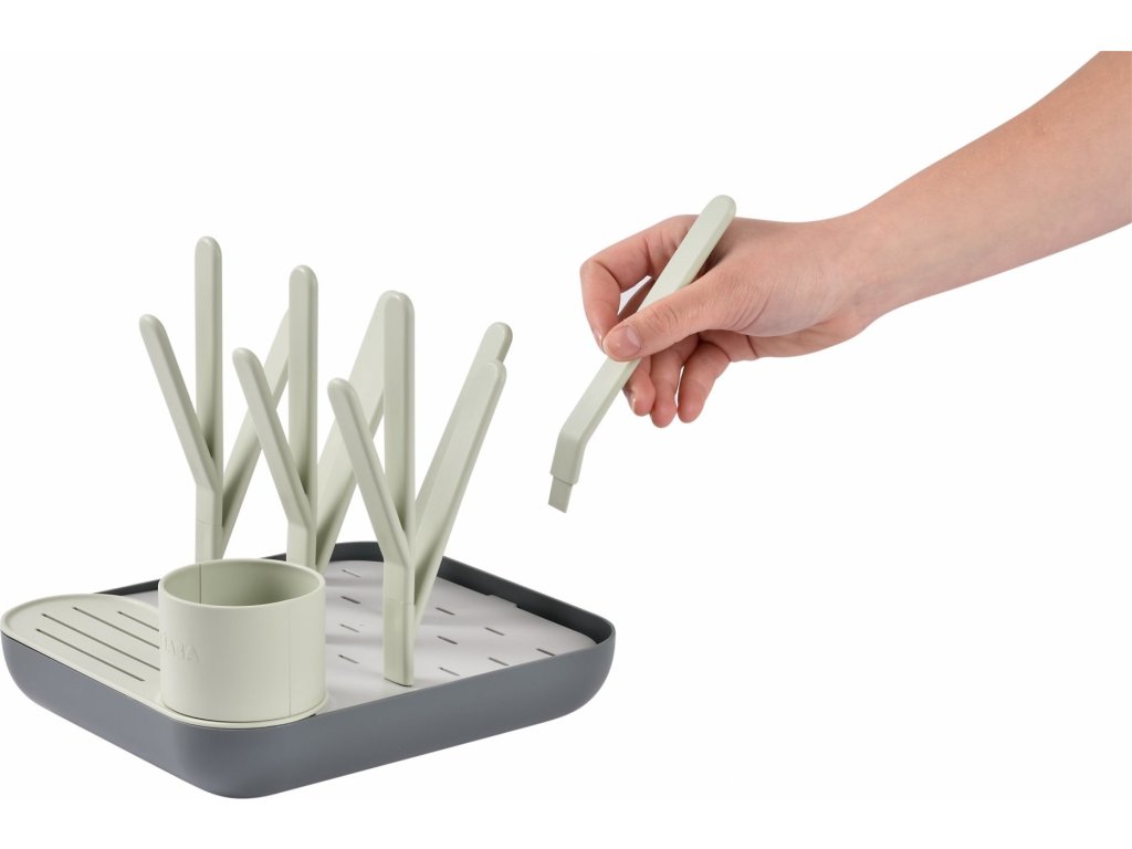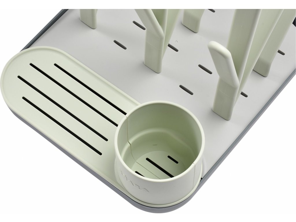 Variabilní stojan Beaba na sušení kojeneckých lahví, hrnků, misek, lžiček a doplňků. Stojan má vyjímatelné držáky a umožňuje tak přizpůsobit jeho uspořádání dle typu a velikosti nádobí, které na stojan potřebujete umístit. Odnímatelná základna usnadňuje údržbu stojanu a zároveň slouží pro uložení jednotlivých součástí stojanu, když jej právě nepoužíváte.