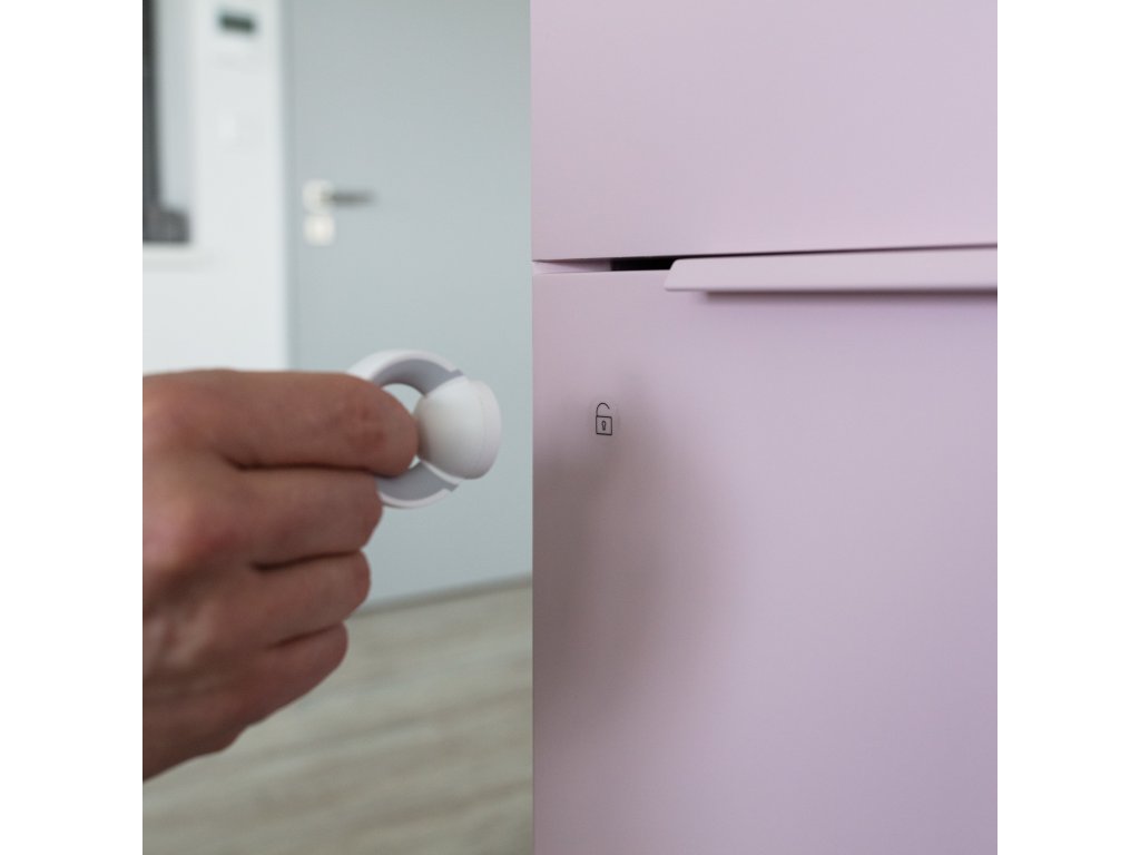 zámku slouží magnetický klíč, přičemž nenápadná infonálepka na dvířkách vás