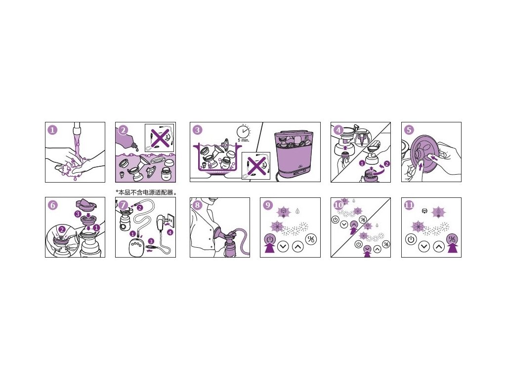 ● Přístroj po zapnutí do elektrické zásuvky nenechávejte bez dozoru. ● Do žádného otvoru ani do silikonové hadičky nezasouvejte ani nevkládejte žádný cizí předmět. ● Silikonovou hadičku nezkracujte. ● Než odsávačku mateřského mléka připojíte do elektrické sítě, přesvědčte se, zda napětí přístroje odpovídá napětí ve vaší elektrické síti. ● Před každým použitím umyjte, propláchněte a sterilizujte příslušné části odsávačky. ● Při čištění součástí odsávačky mateřského mléka nepoužívejte antibakteriální ani abrazivní čisticí prostředky nebo saponáty. ● Součásti odsávačky mateřského mléka nebo kabel USB nikdy nedávejte do vody ani do sterilizátoru, jinak je můžete trvale poškodit. ● Pokud je vzniklý podtlak nepříjemný nebo bolestivý, odsávačku mateřského mléka vypněte, prstem uvolněte prs od trubice odsávačky a odsávačku z prsu sejměte. Uvolnit podtlak můžete také vytažením silikonové hadičky z motoru nebo uzávěru. ● Nedosáhnete-li žádného výsledku, nepokračujte v odsávání déle než 5 minut. ● Odsávačku mateřského mléka nepoužívejte, pokud se silikonová membrána zdá být poškozená nebo prasklá. Silikonovou membránu vyměňte. Přečtěte si kapitolu „Objednávání příslušenství“, kde najdete informace o tom, jak získat náhradní díly. ● Pro bezpečnost vašeho dítěte vždy postupujte podle pokynů v uživatelské příručce lahví a dudlíků.