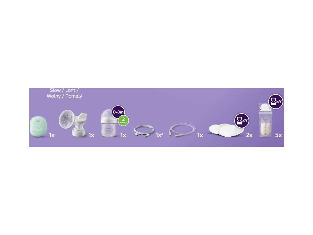 Sáčky na mléko: 5 ks, Motorová jednotka, Silikonová hadička, Kabel USB-C, Lahev Natural (125 ml), Sada pro odsávání, Šroubovací víčko, Uzavírací destička: 1 ks, Dudlík s pomalým průtokem: 1 ks, Prsní vložky: 4 ks