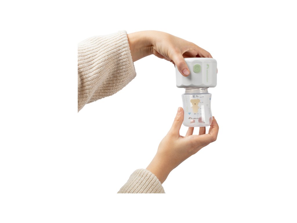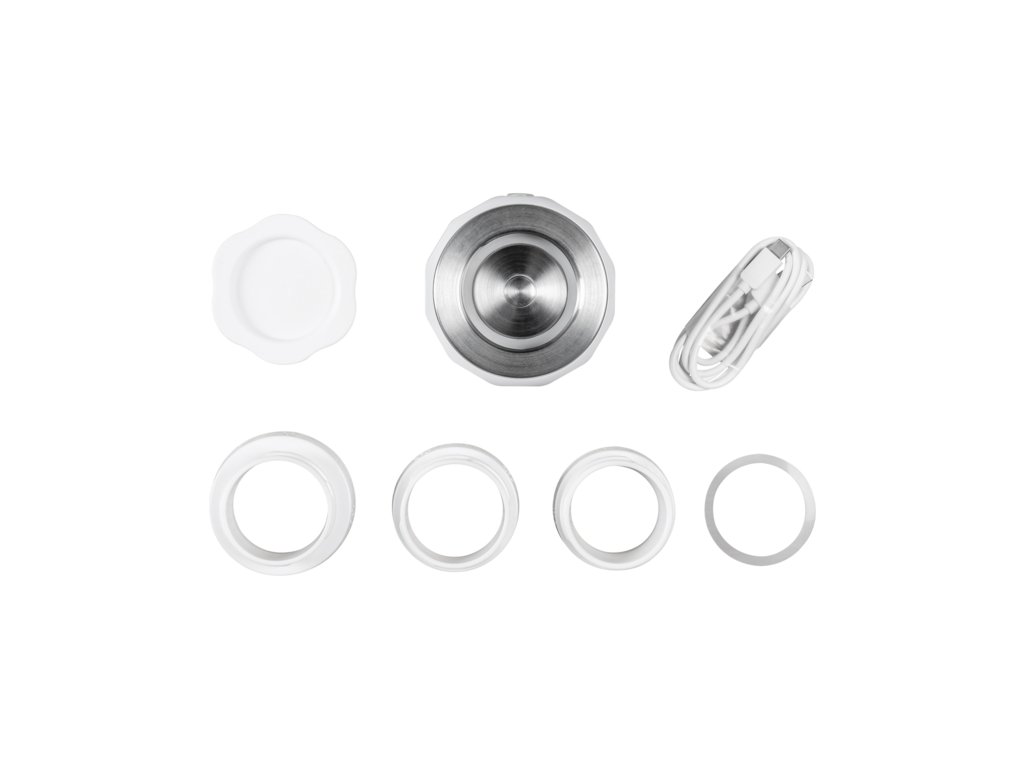 Součástí balení je ochranné víko, USB-C nabíjecí kabel, náhradní silikonové těsnění, 50mm adaptér na láhev (NUK), 60mm adaptér na láhev (Tommee Tippee), 53mm adaptér na láhev (MAM).