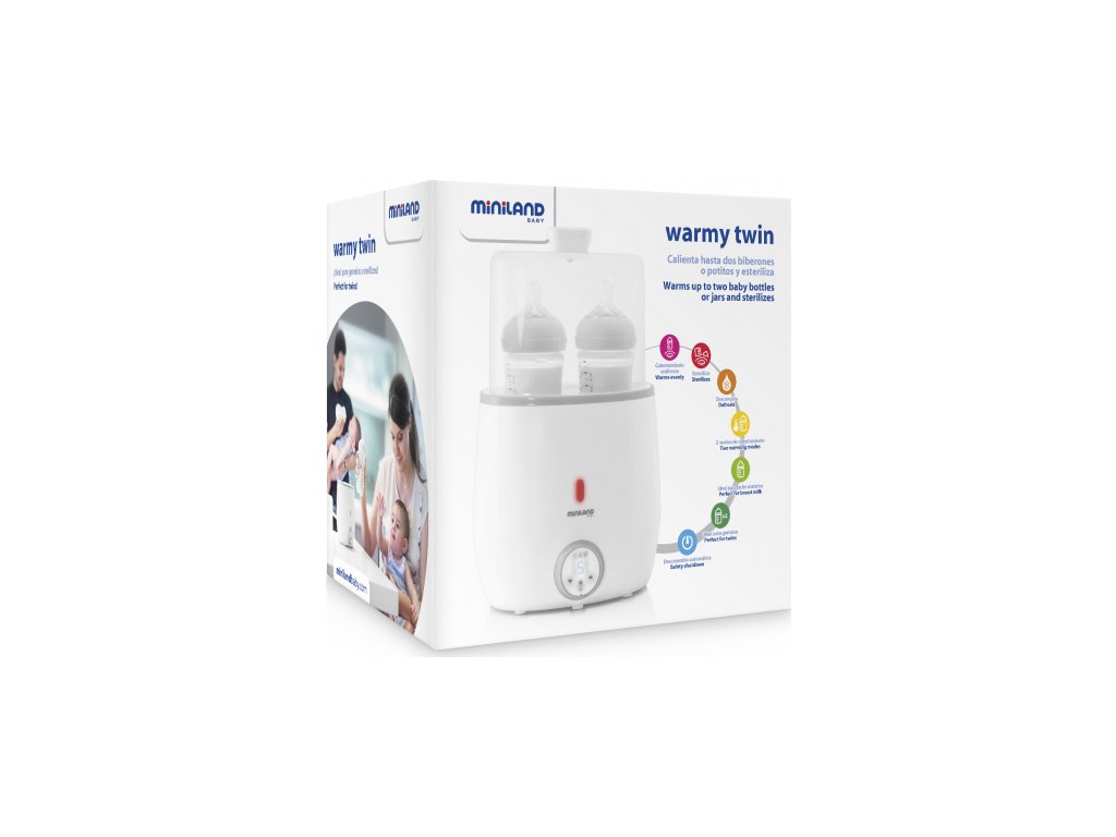 Ohřívačka pro dvě kojenecké láhve Miniland Warmy Twin je ideální řešení pro rodiče dvojčat. Ohřívačka rychle a snadno ohřeje či sterilizuje současně dvě kojenecké lahvičky nebo skleničky s příkrmem.