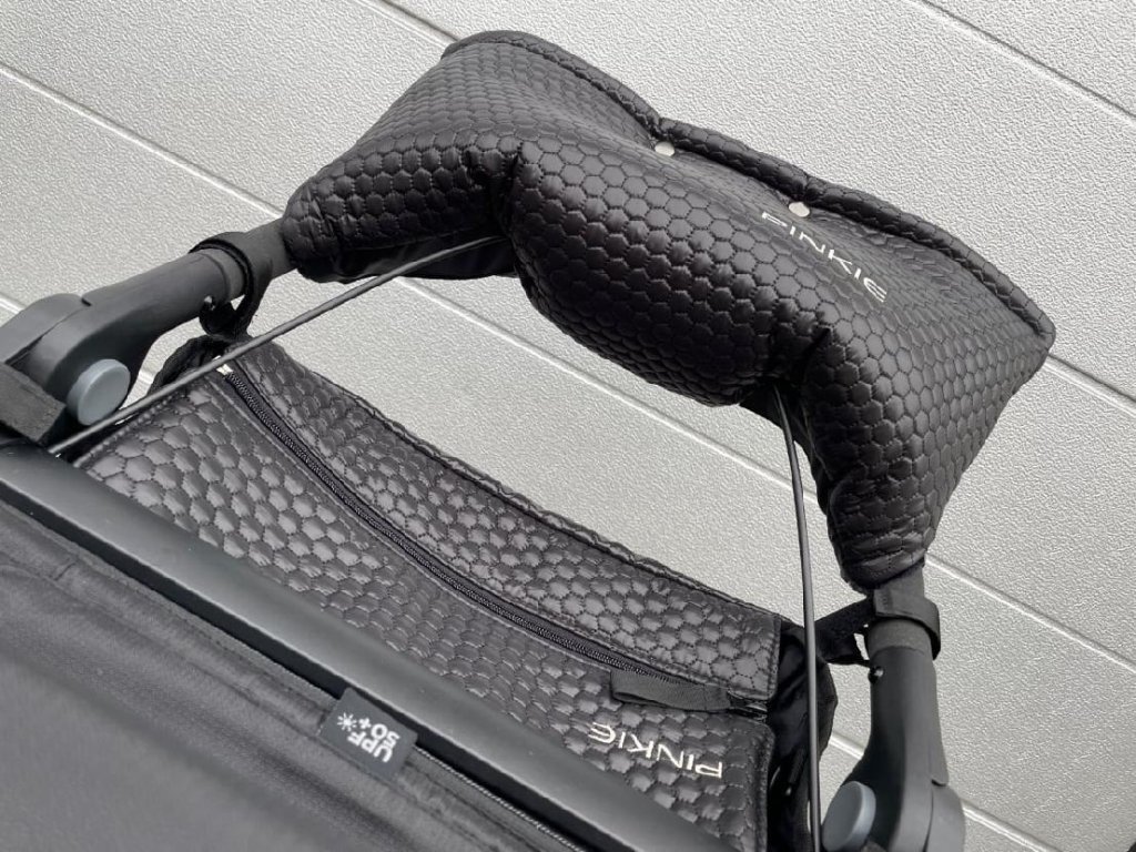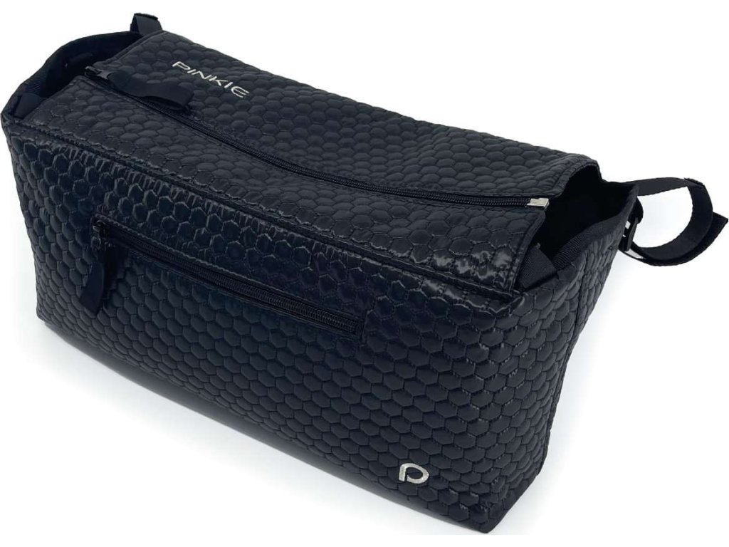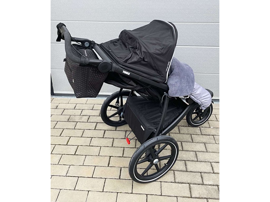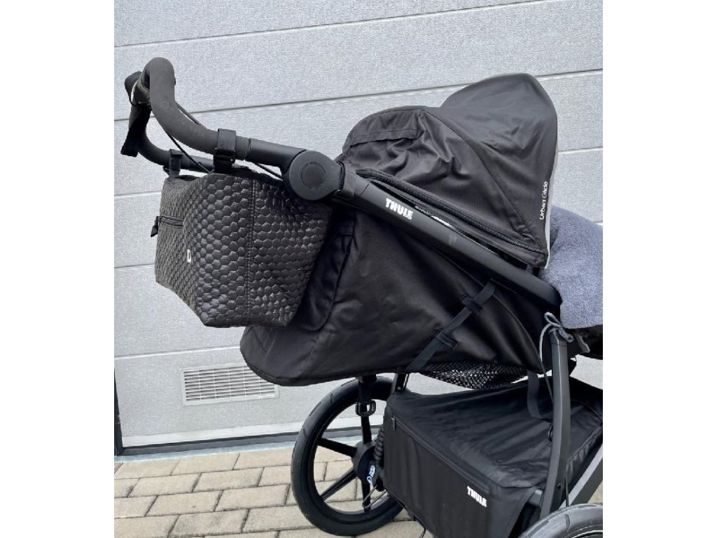 Objemný organizér vytvořený na kočárek Thule nebo jemu podobný. Jeho specifickému madlu jsme navrhli organizér, který na míru sedí a kopíruje tvar kočárku. Proto i po sklopení sedačky do polohy v leže, organizér nepřekáží, protože má zkosený tvar.