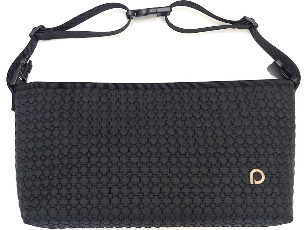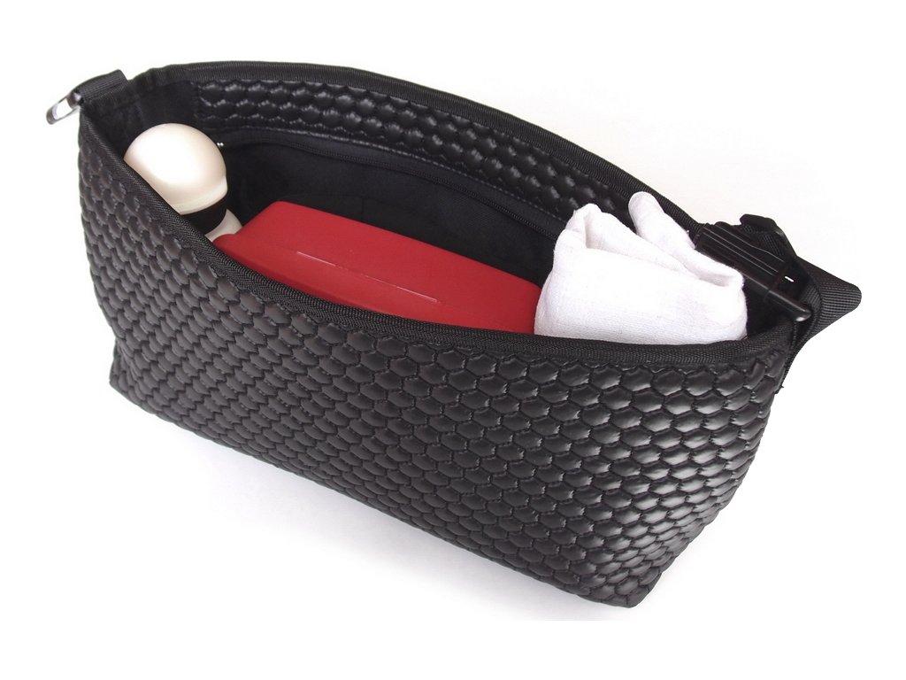 Uvnitř je kapsička na drobnosti a tři očka z gumy,kam snadno a bezpečně můžete postavit lahvičku s pitím.