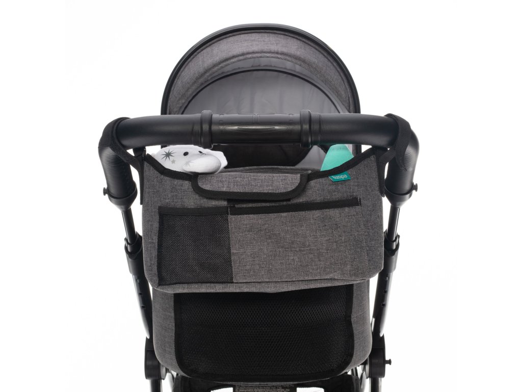 Organizér na kočárek PLUS je svojí perfektní velikostí vhodný ke každému kočárku. Je velmi prostorný a obsahuje až 6 kapes, které vyhoví potřebám a požadavkům každé moderní maminky. Samozřejmostí je přední kapsa na mobil a kapsa na drobnosti. V zadní části organizéru se nachází větší síťovinová kapsa na umístění časopisů. Hlavní kapsa je řešena tak, aby se po bocích daly umístit láhve. Jeho instalace je jednoduchá a rychlá za pomoci háčků na suché zipy.