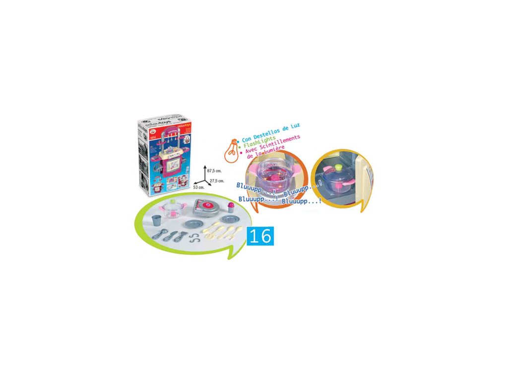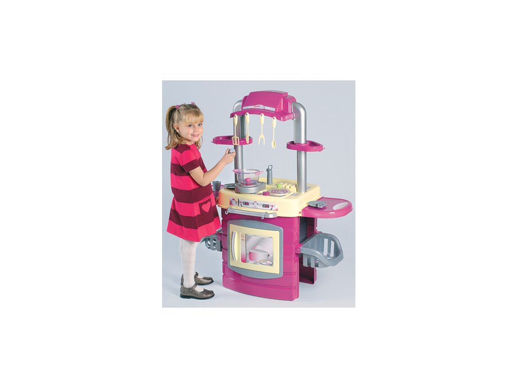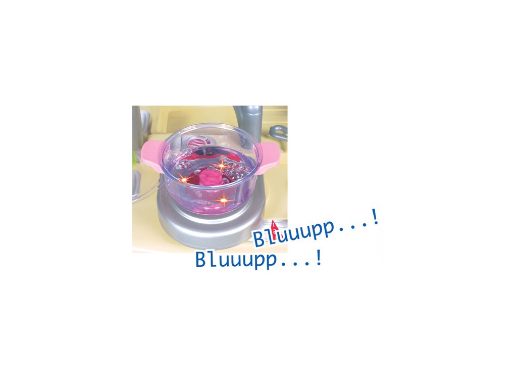 Úžasná kuchyňka se sporákem vydává realistické zvuky vaření a svítí! Obsahuje 16 kusů příslušenství: talířky, solničku, hrneček, hrnec a příbory. Součástí kuchyňky je i pracovní pult se dřezem a pákovou baterií, trouba a myčka, po stranách jsou dva odkládací pulty a košíky na nádobí.
