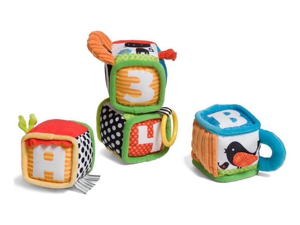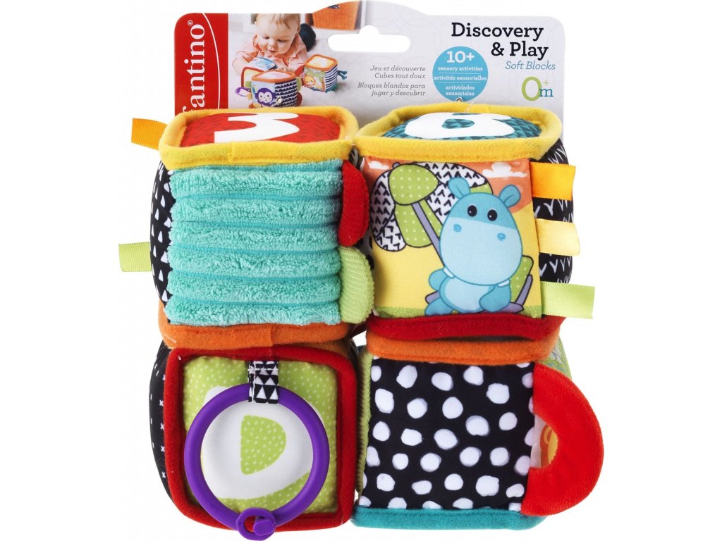 Čtyři měkké textilní kostky nabízí různorodé aktivity a textury ke zkoumání a pozorování. Kostky je možné skládat na sebe i s nimi házet, ve starším věku dítěte s jejich pomocí můžete dítě učit barvy a první písmenka i čísla.