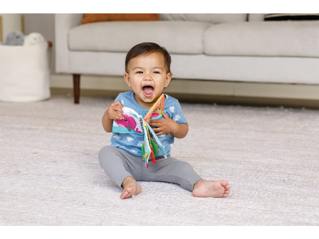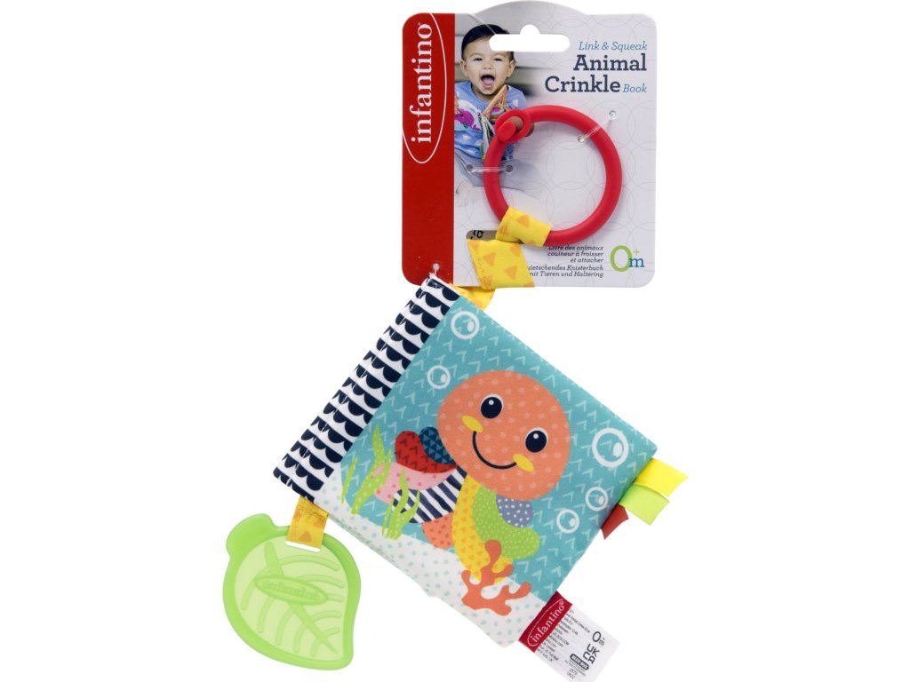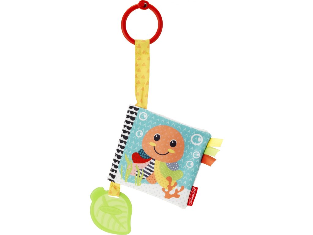 Textilní knížka s výraznými obrázky zvířátek ve vysoce kontrastních barvách pomáhá rozvíjet zrak dítěte a nabízí dítěti různorodé textury ke zkoumání. Jednotlivé stránky při zmáčknutí šustí či pískají, součástí je i kousátko v podobě lístku, které pomůže dítěti při prořezávání prvních zoubků. Kroužek umožňuje zavěšení na kočárek či autosedačku.