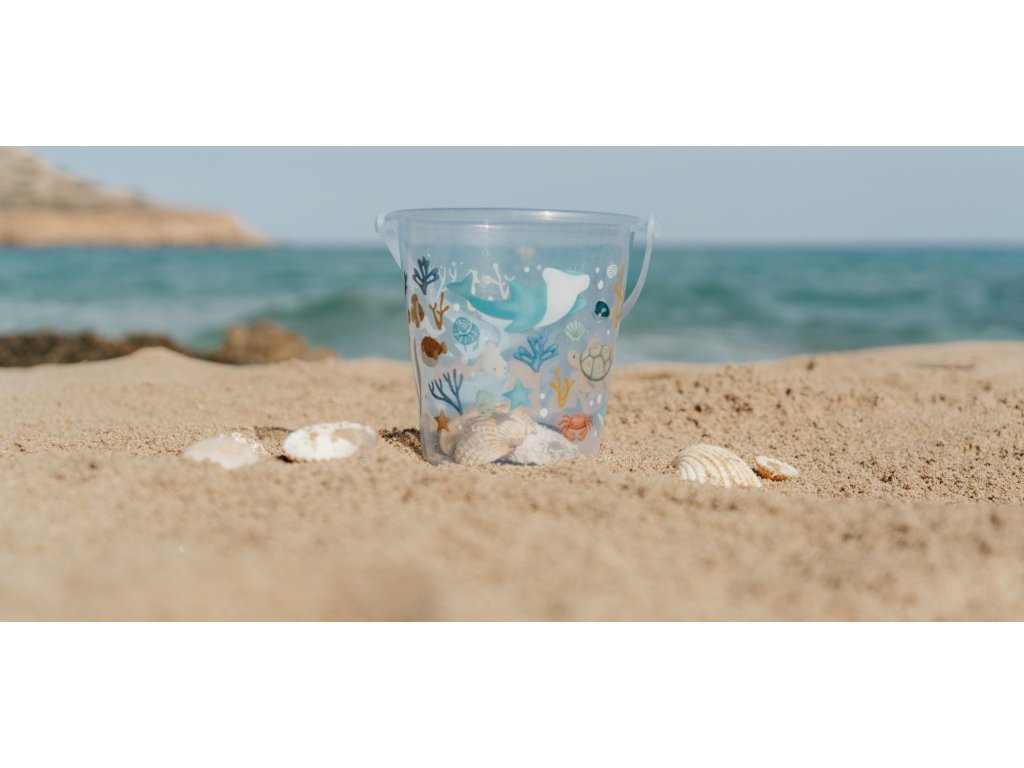 Kyblík na písek s krásným potiskem motivů ze života pod mořskou hladinou se bude dětem hodit doma na zahradě i u moře na pláži. Držadlo umožňuje snadné přenášení.