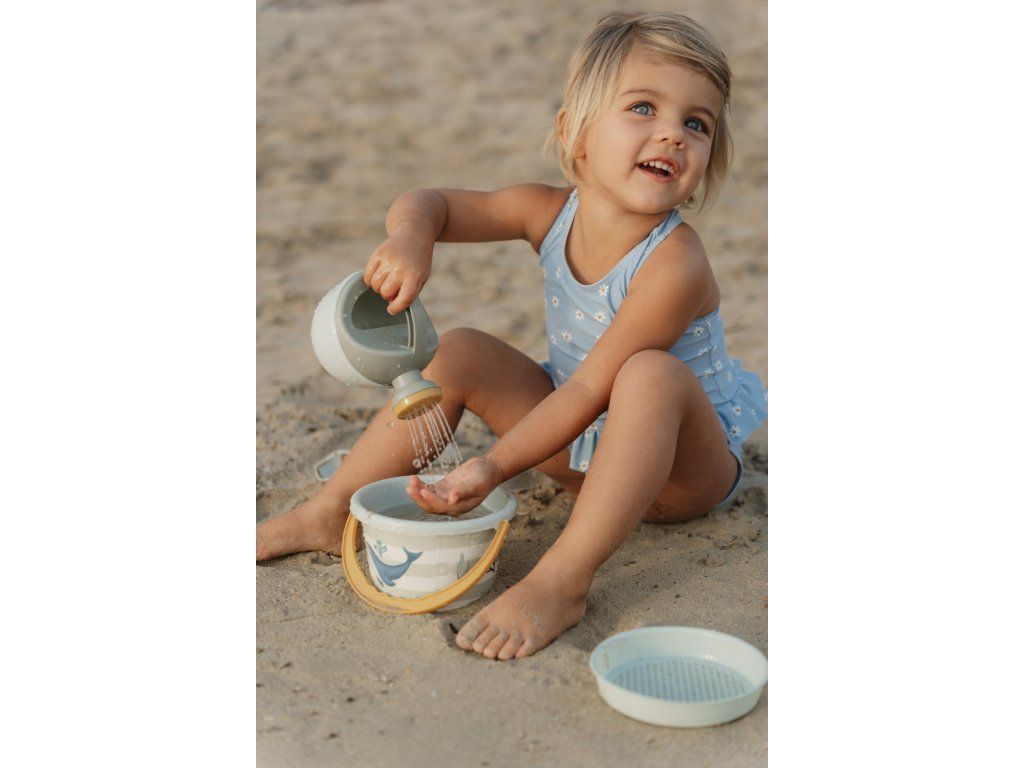 Sada na písek s krásným potiskem motivů ze života pod mořskou hladinou se bude dětem hodit doma na zahradě i u moře na pláži. Sadu tvoří kyblík, konvička, hrabičky, lopatka a sítko v kvalitním provedení z pevného plastu.