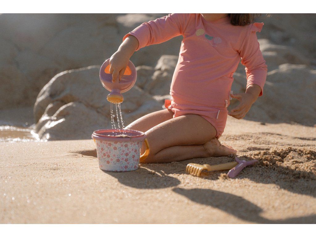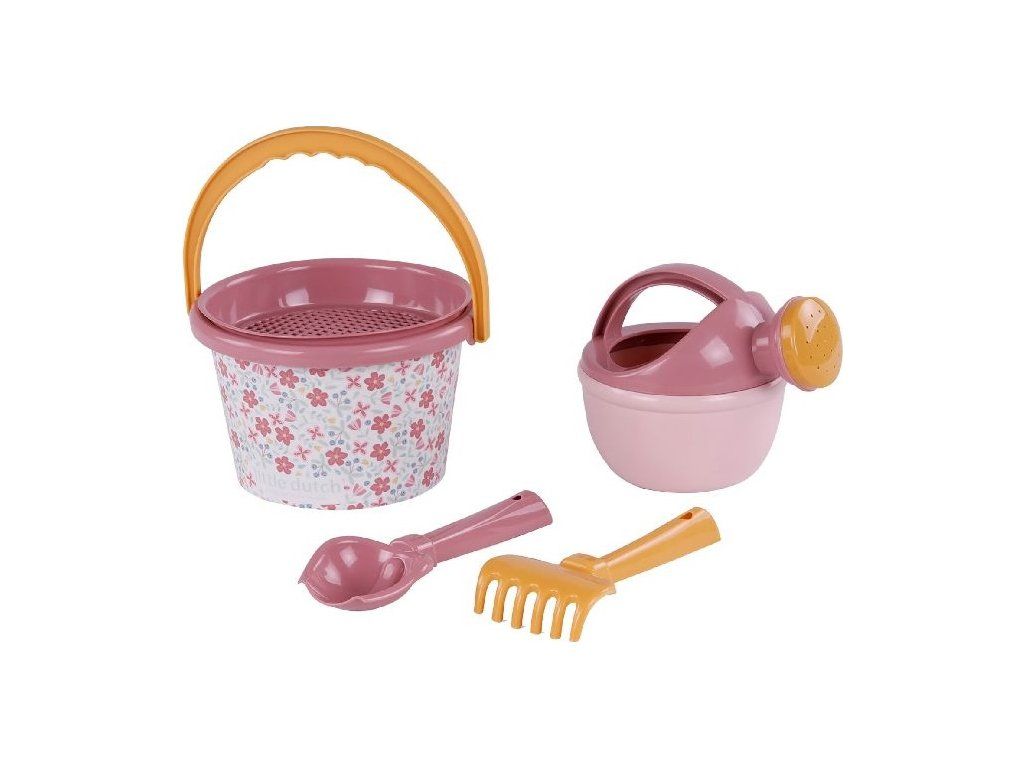 Sada na písek s krásným květinovým potiskem se bude dětem hodit doma na zahradě i u moře na pláži. Sadu tvoří kyblík, konvička, hrabičky, lopatka a sítko v kvalitním provedení z pevného plastu.