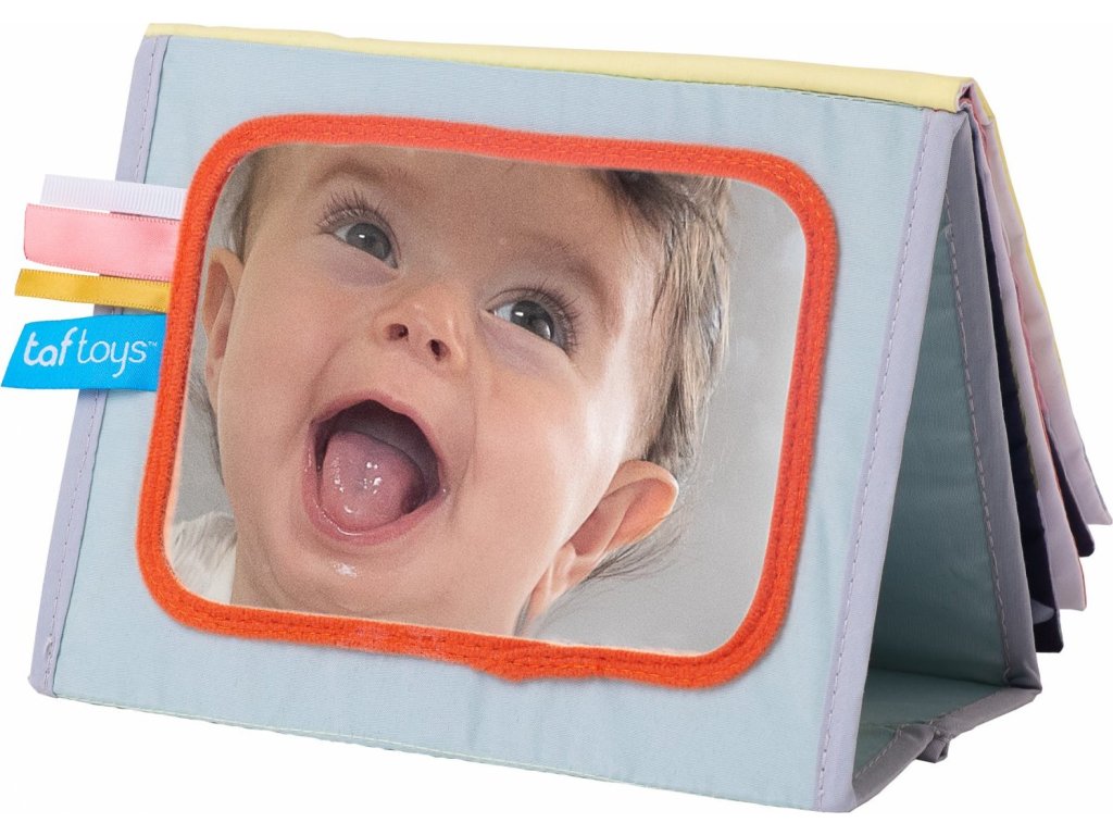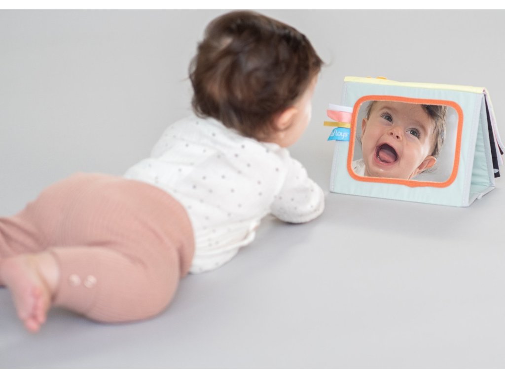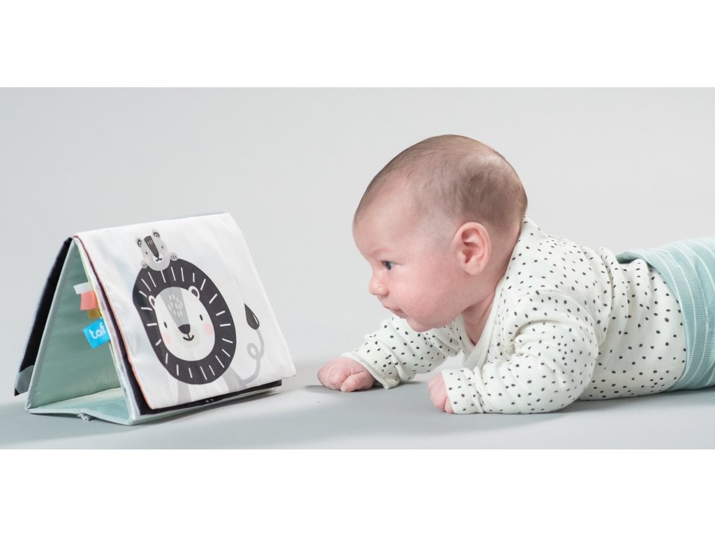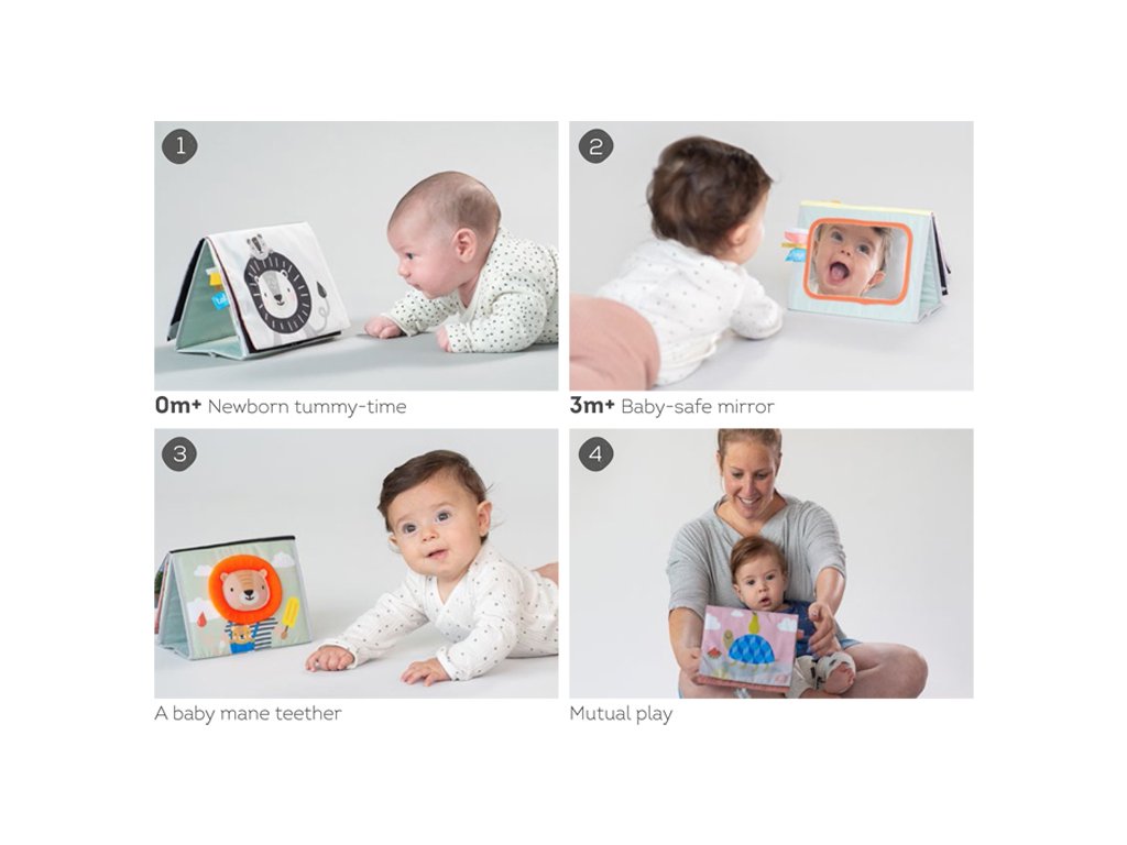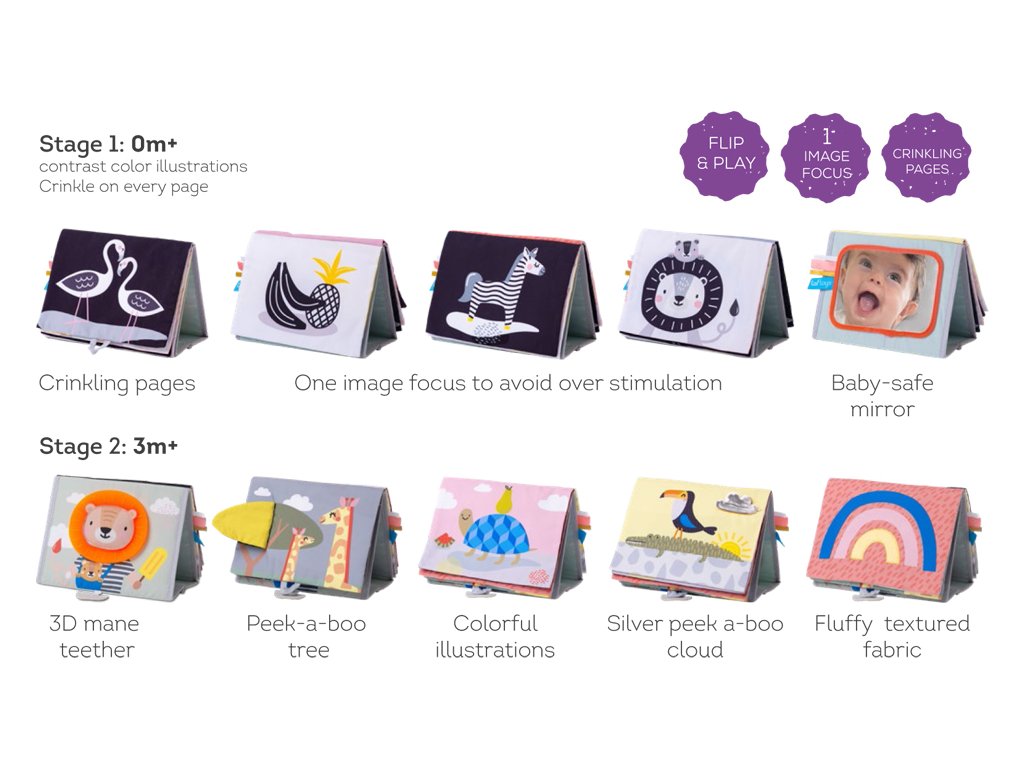 - 0-3 měsíce: stránky s bezpečným zrcátkem a vysoce kontrastními jednoduchými obrázky, které podněcují rozvoj smyslů a emoční inteligence dítěte.