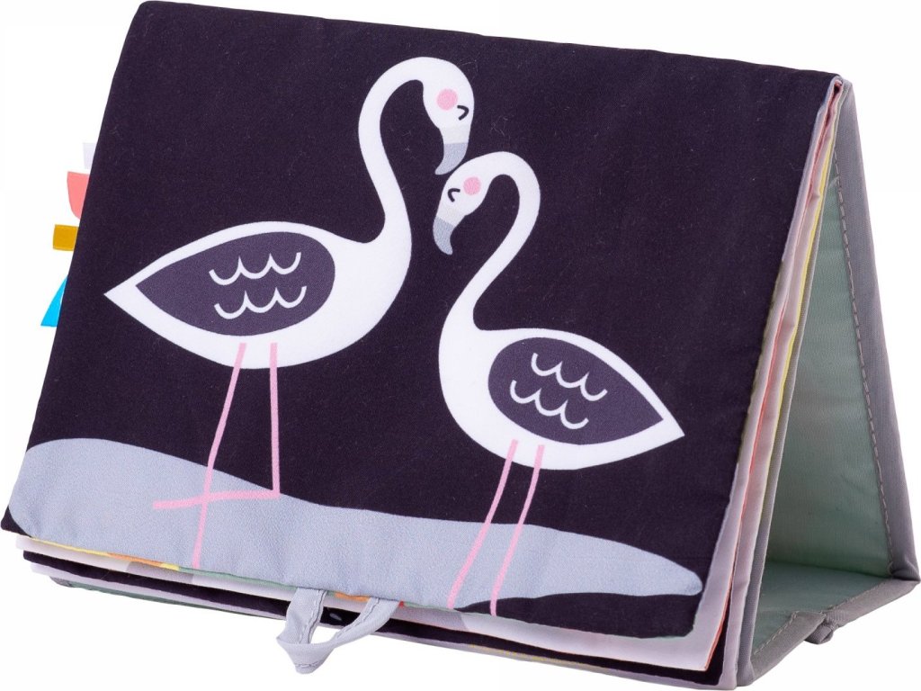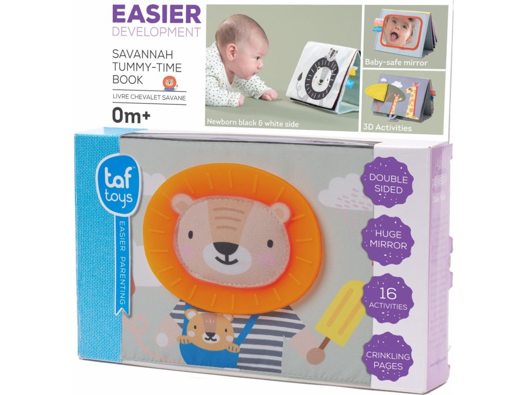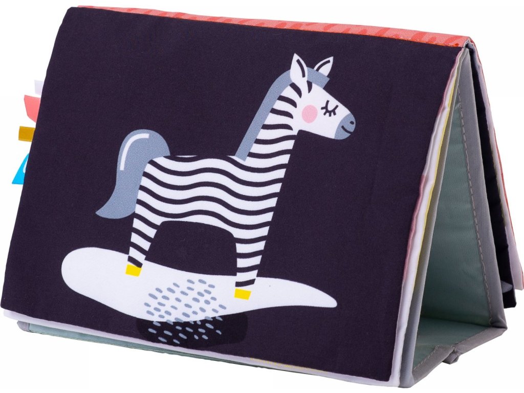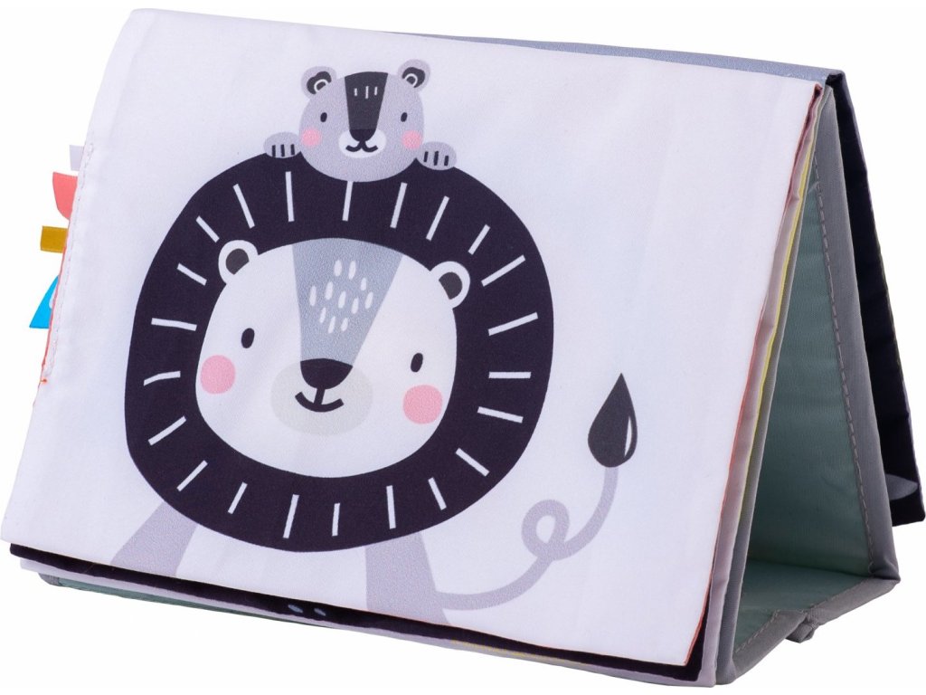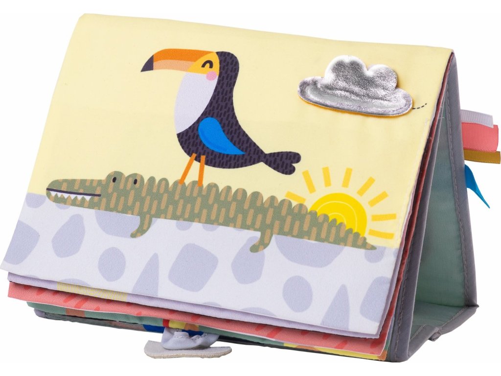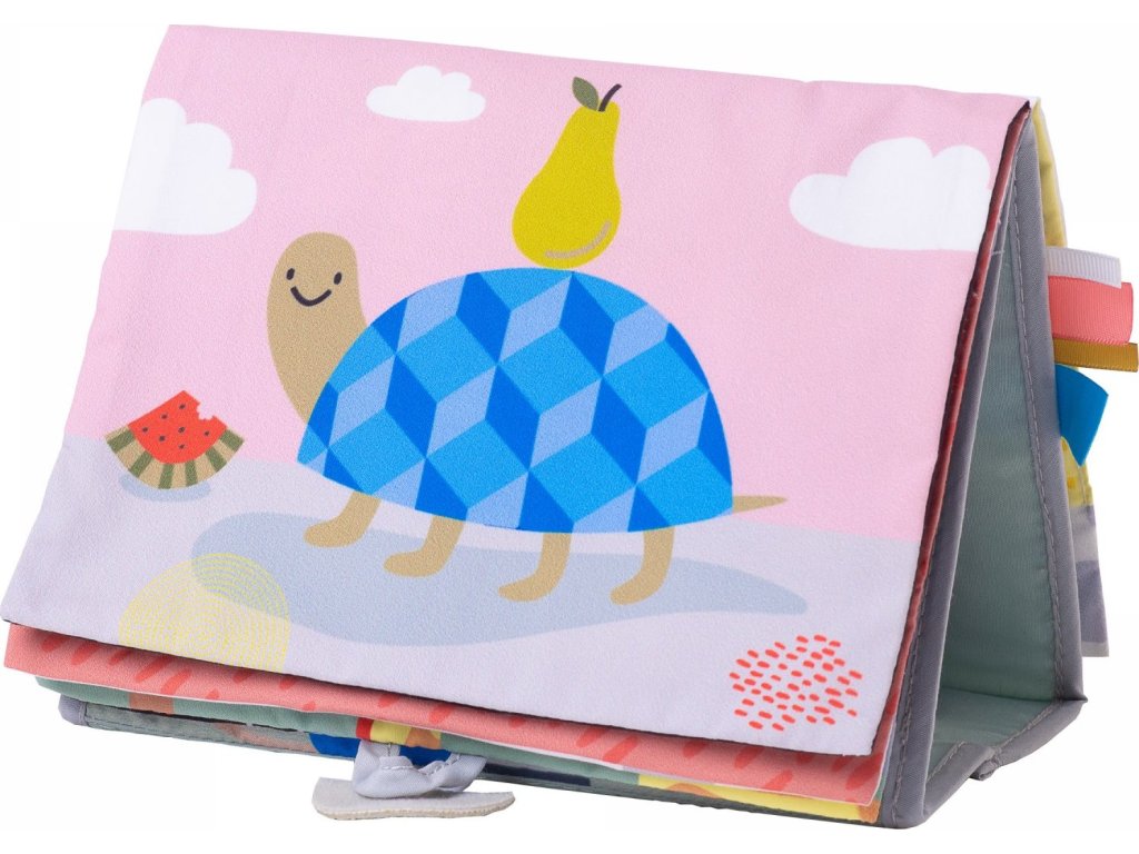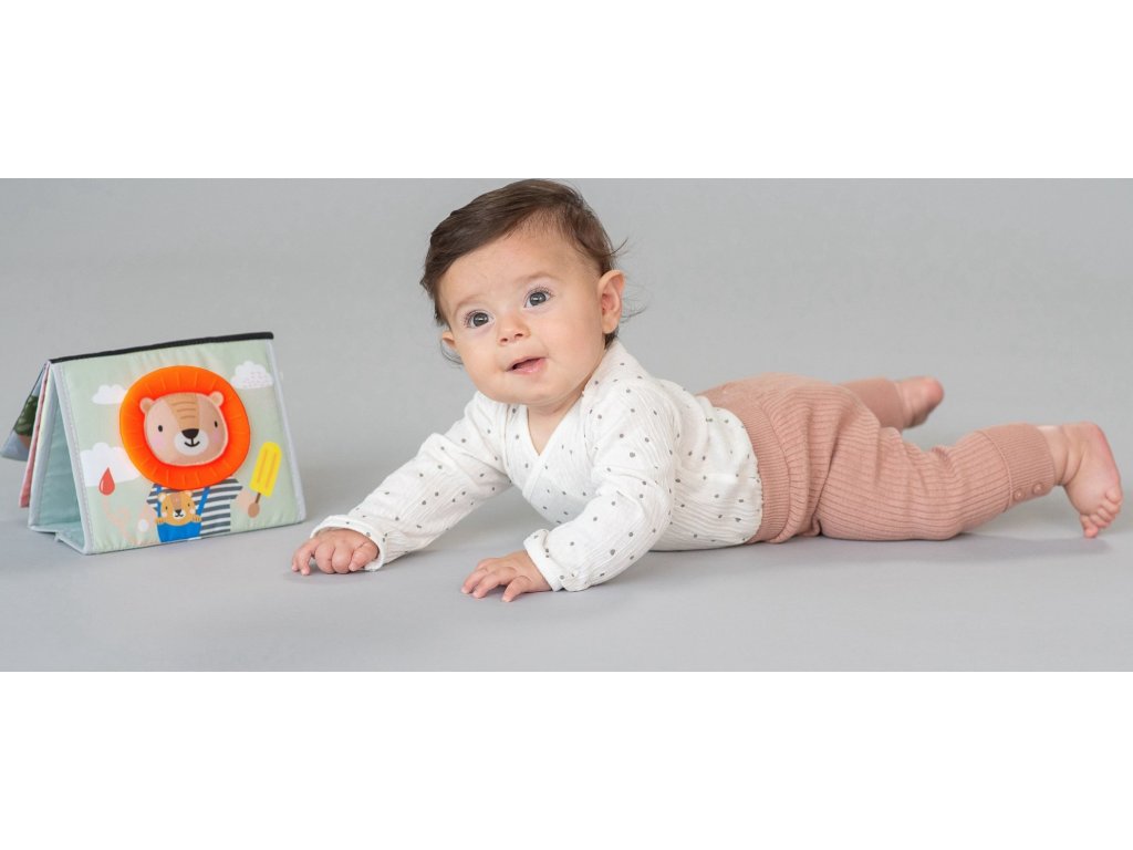 Textilní knížka s otáčecími šustícími stránkami ve tvaru stolního kalendáře nabízí množství neodolatelných obrázků s různorodými texturami, bezpečným zrcátkem, kousátkem apod. Ideální pro postavení před dítě při hře na bříšku.