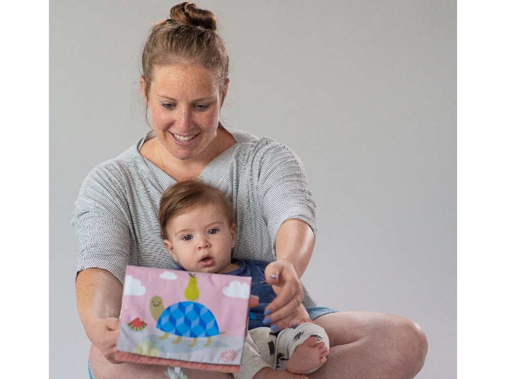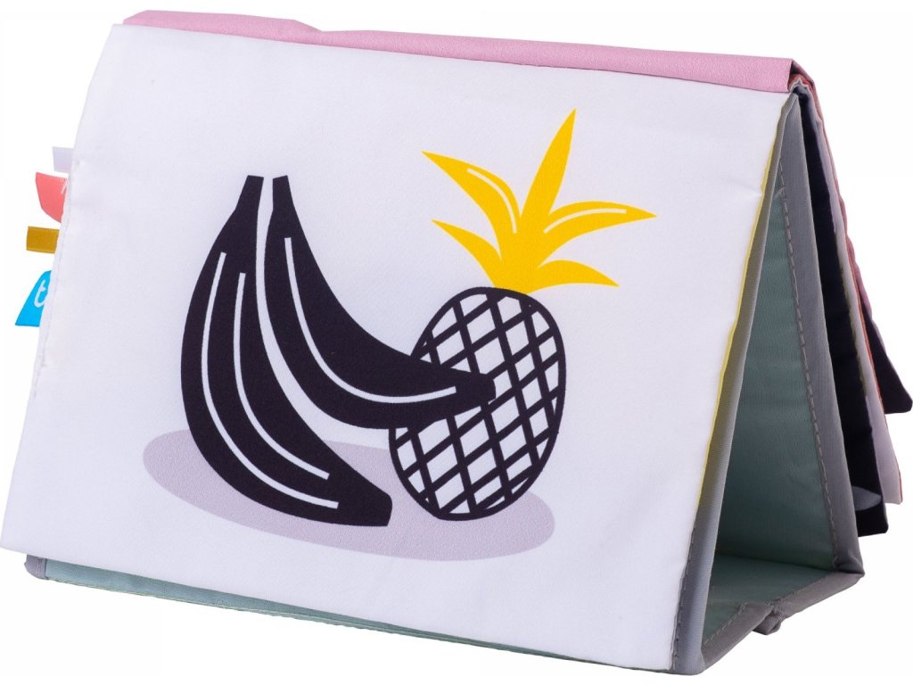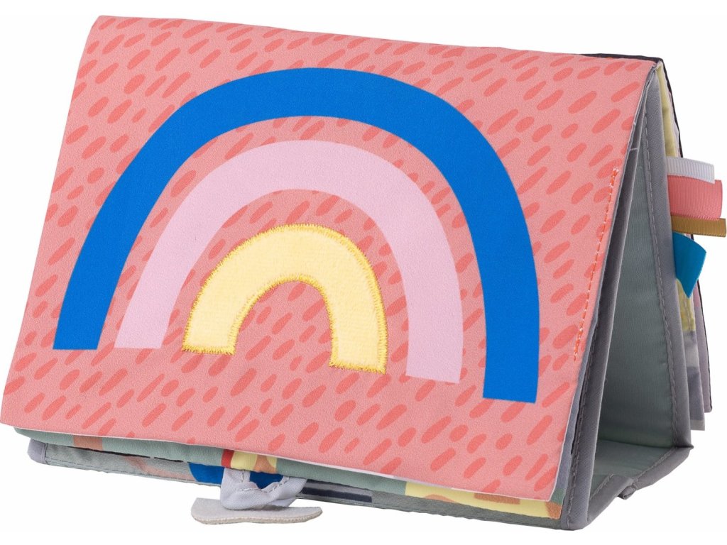 - Od 3 měsíců: strana s barevnými obrázky a různorodými texturami ke zkoumání, které podporují rozvoj smyslů a jemné motoriky dítěte.