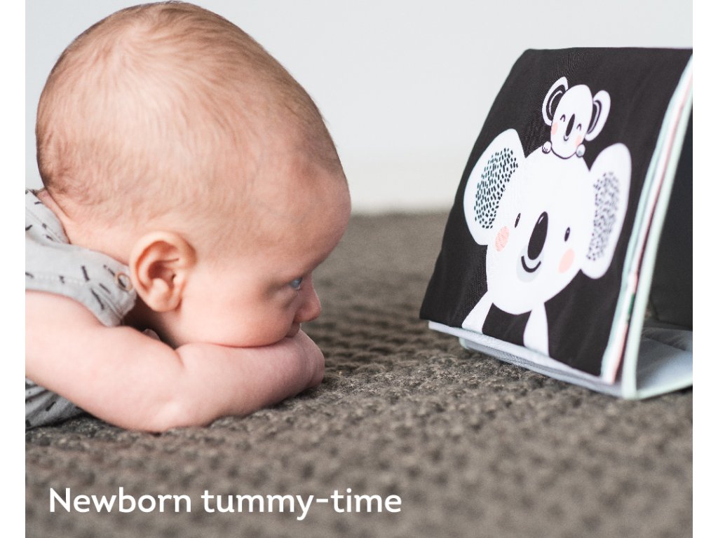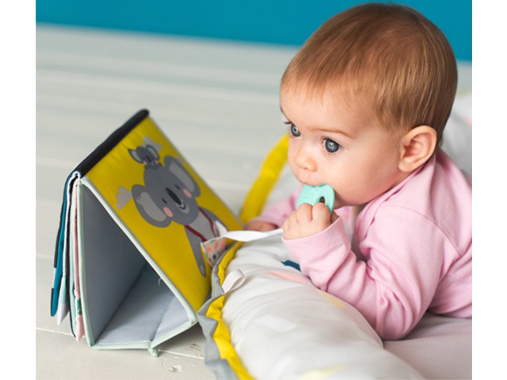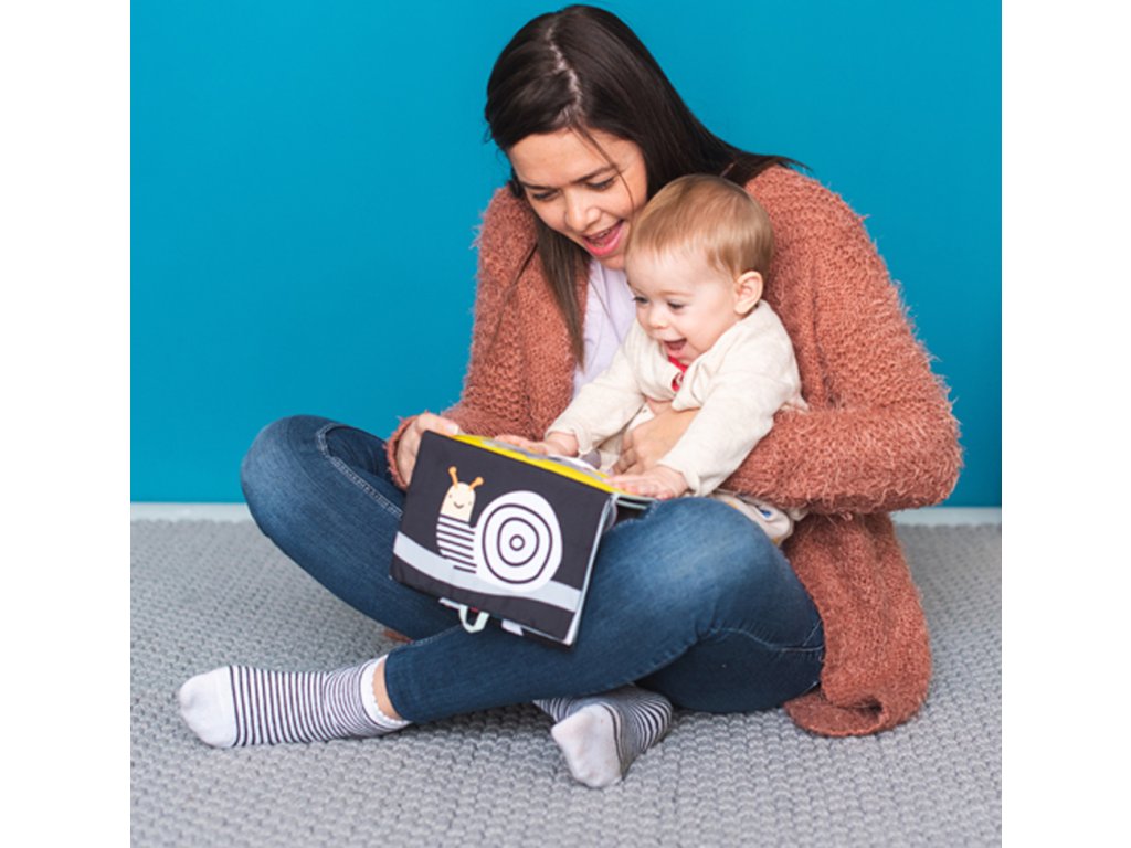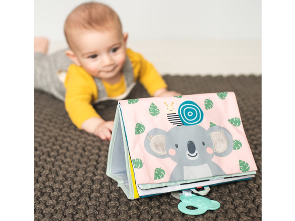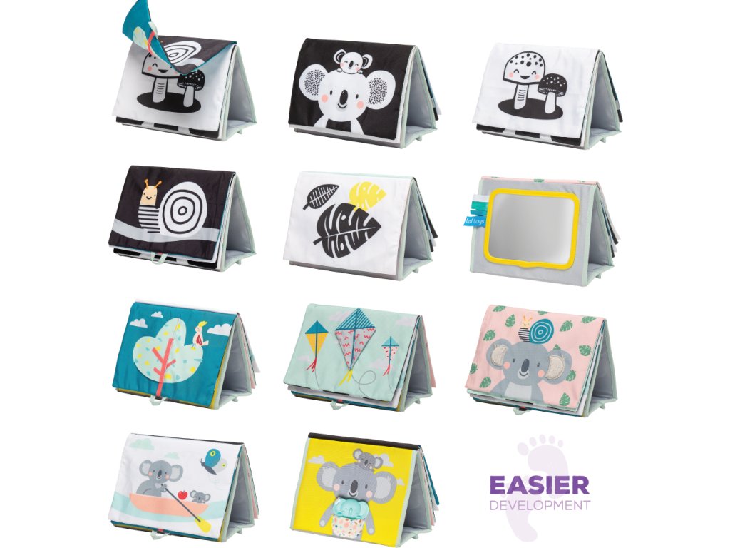 - Od 3 měsíců: strana s barevnými obrázky a různorodými texturami ke zkoumání, které podporují rozvoj smyslů a jemné motoriky dítěte.