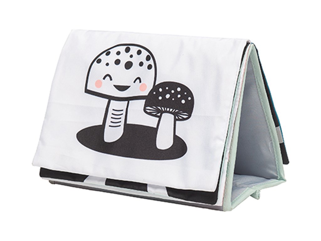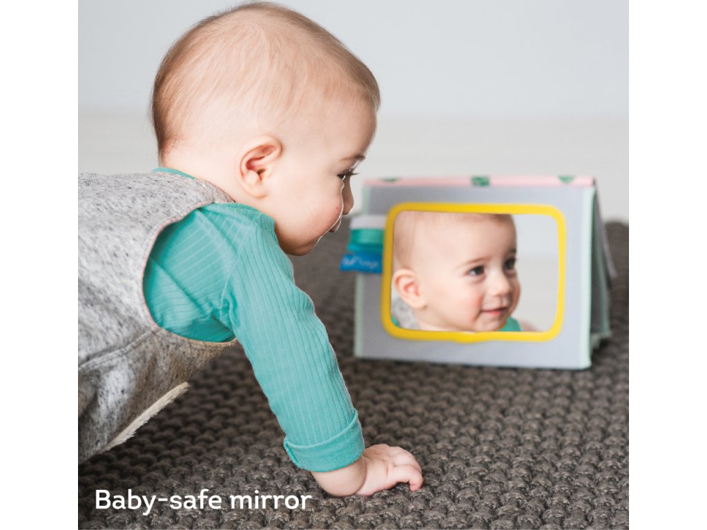 - 0-3 měsíce: stránky s bezpečným zrcátkem a vysoce kontrastními jednoduchými obrázky, které podněcují rozvoj smyslů a emoční inteligence dítěte.
