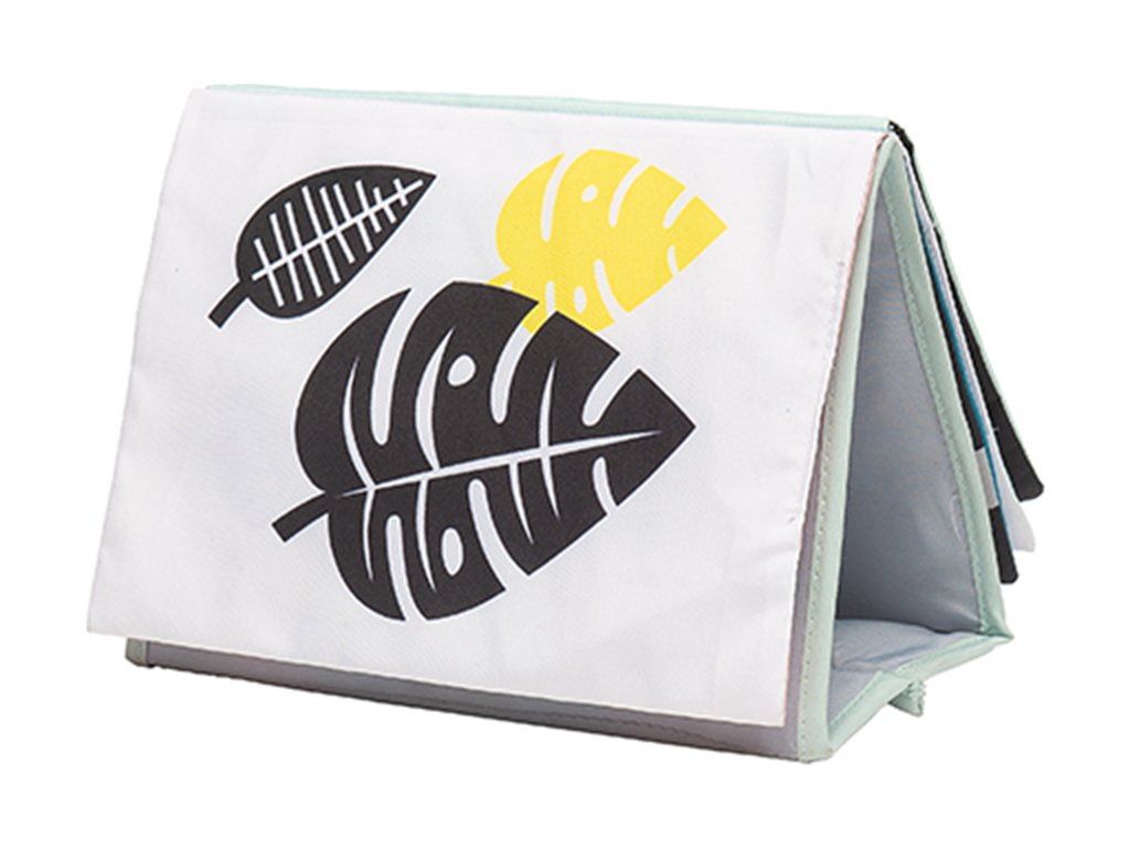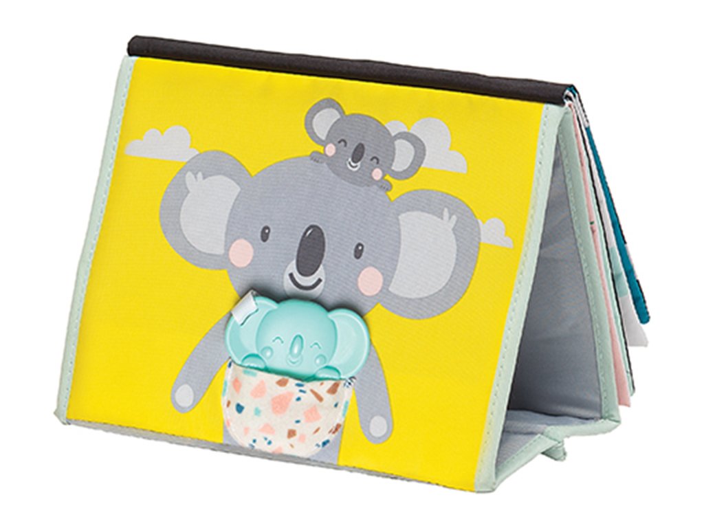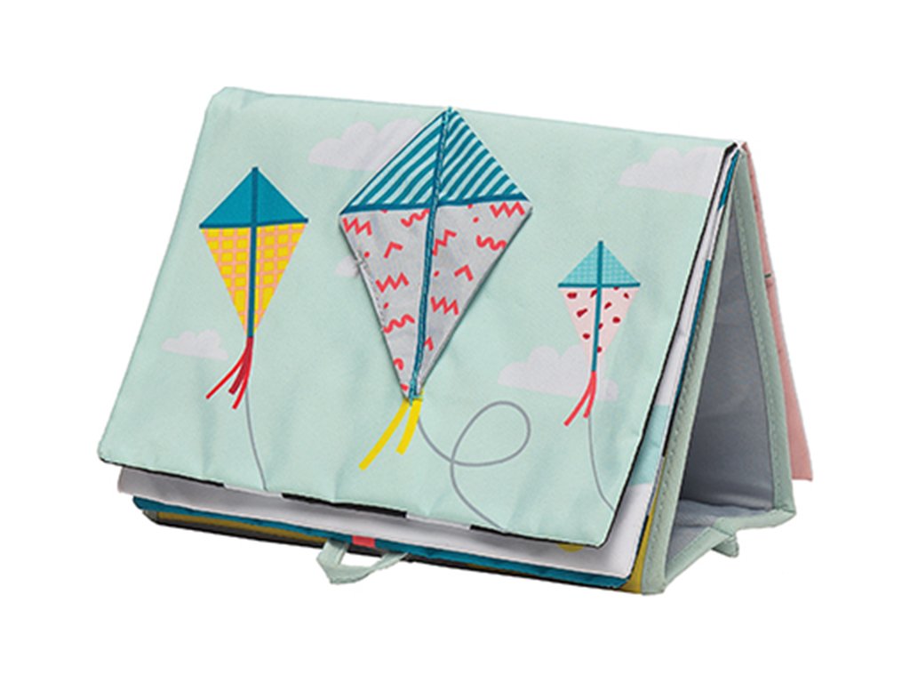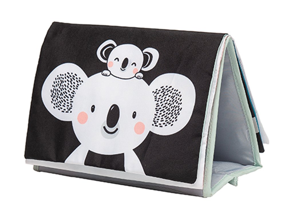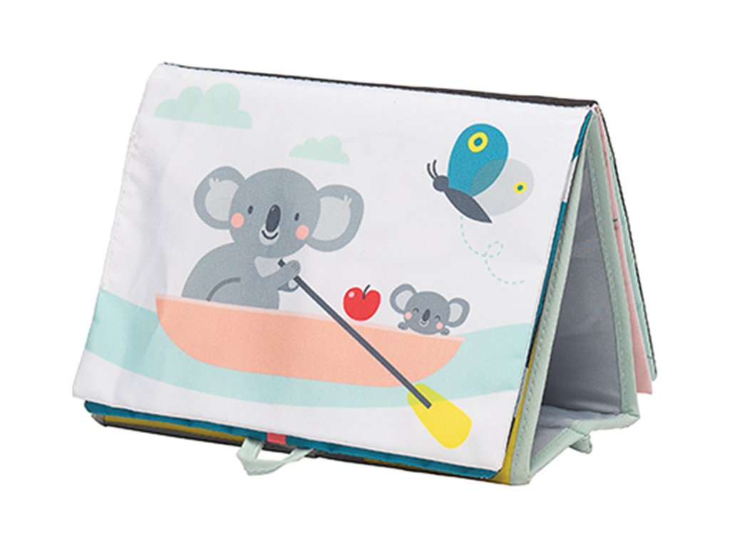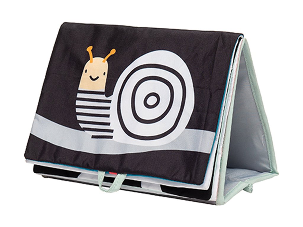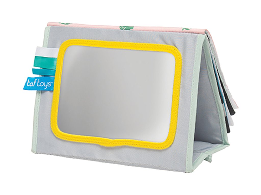Textilní knížka s otáčecími šustícími stránkami ve tvaru stolního kalendáře nabízí množství neodolatelných obrázků s různorodými texturami, bezpečným zrcátkem, kousátkem apod. Ideální pro postavení před dítě při hře na bříšku.