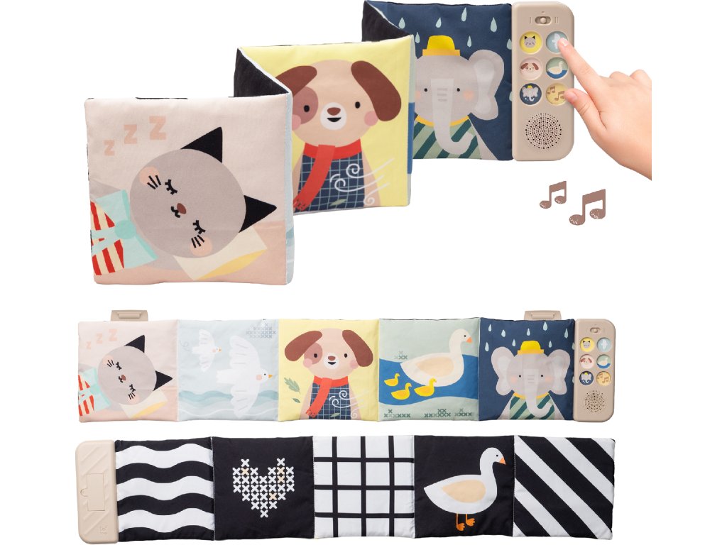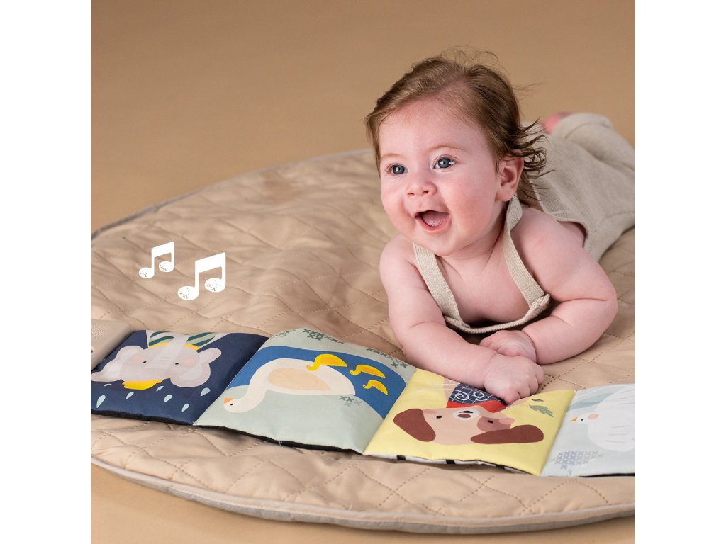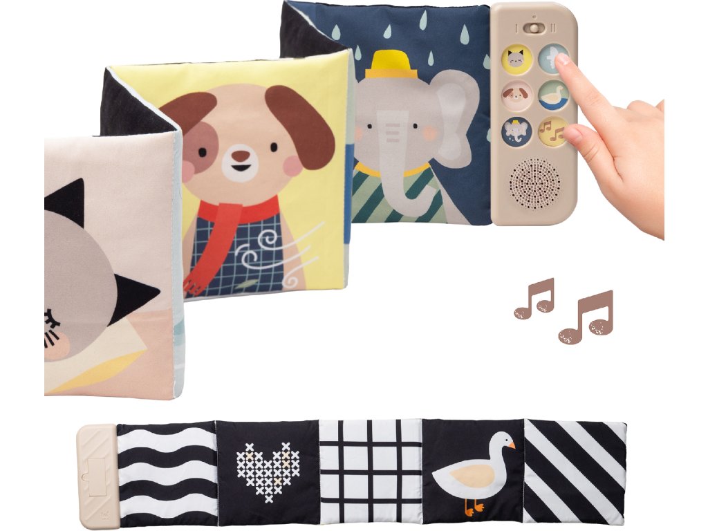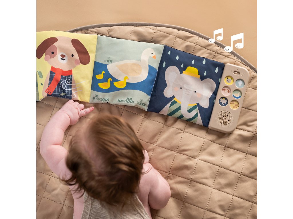 Oboustranná textilní knížka Taf Toys pomůže zabavit a zklidnit miminko už od narození. Knížka samostatně stojí a je tak ideální pro hraní na bříšku. Díky klipům ji snadno umístíte i do kočárku pro zabavení dítěte na cestách.