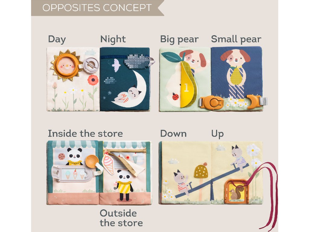 Objevování světa protikladů nebylo nikdy zábavnější! Tato barevná a interaktivní kniha plná různorodých aktivit představuje dětem základní pojmy jako velký & malý nebo den & noc a přitom rozvíjí jemnou motoriku, jazyk i první matematické dovednosti.
