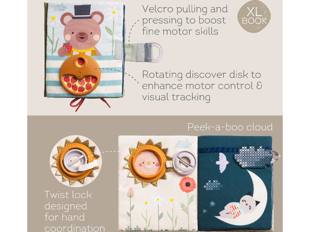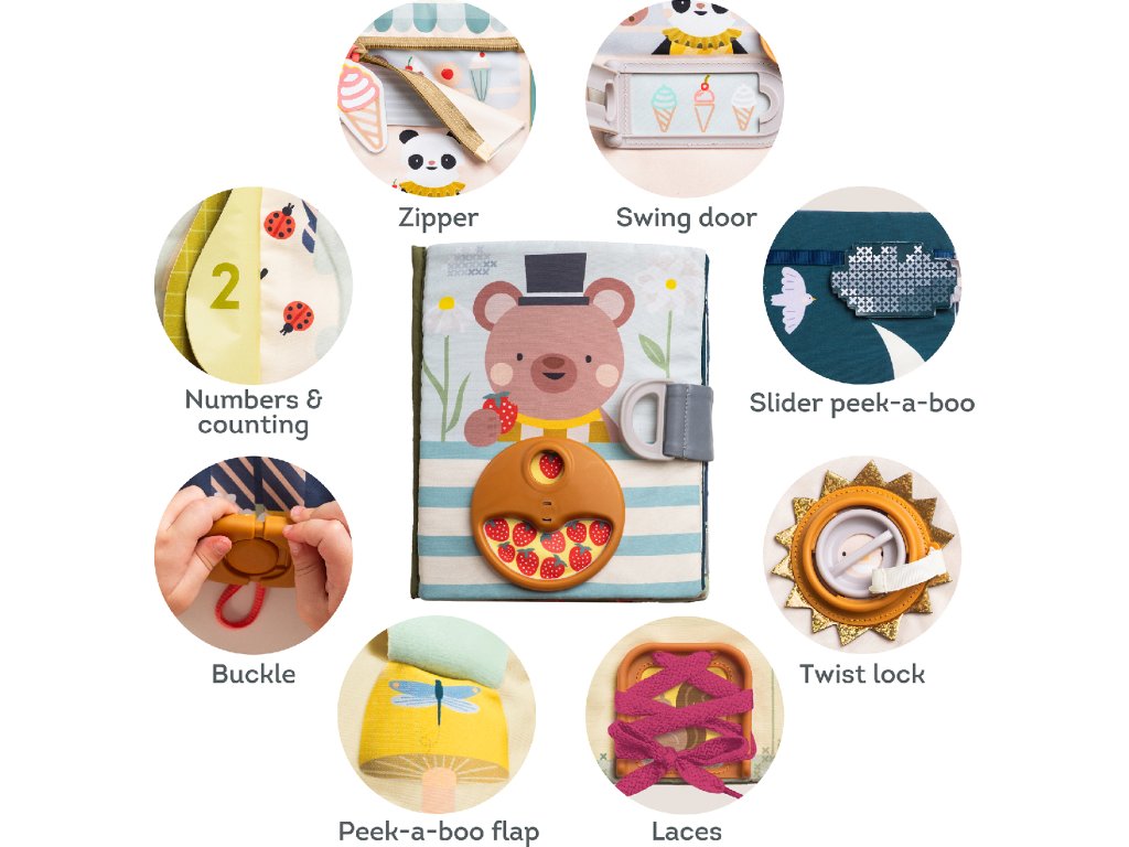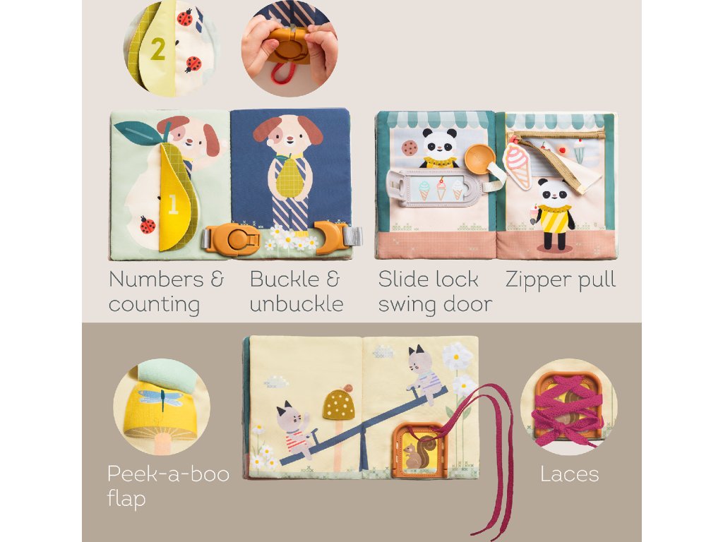 - 15 interaktivních aktivit - zipy, přezky, tkaničky nebo schovávačky – vše, co malé ručičky potřebují k procvičení dovedností jako je zapínání, vázání a oblékání