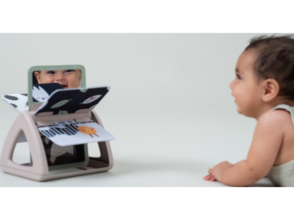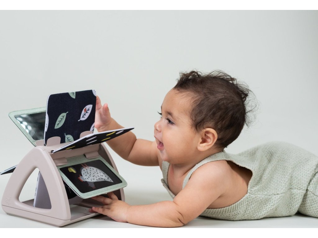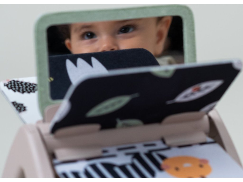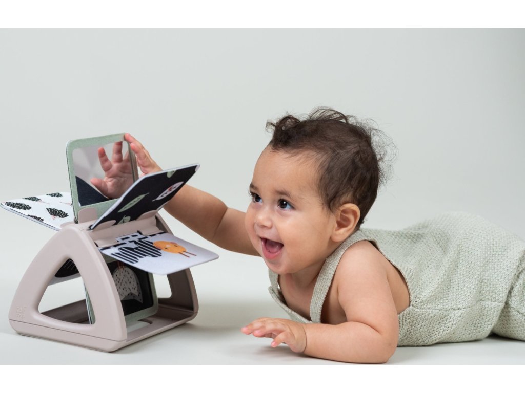 - Od 2 měsíců: výrazné obrázky, bezpečné zrcátko, hologramový třpytivý obrázek a chrasticí zvuk při otáčení jednotlivých stránek upoutají pozornost dítěte při hře na bříšku
