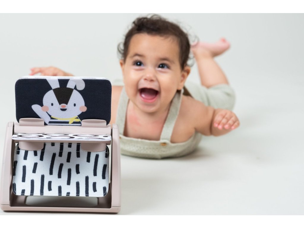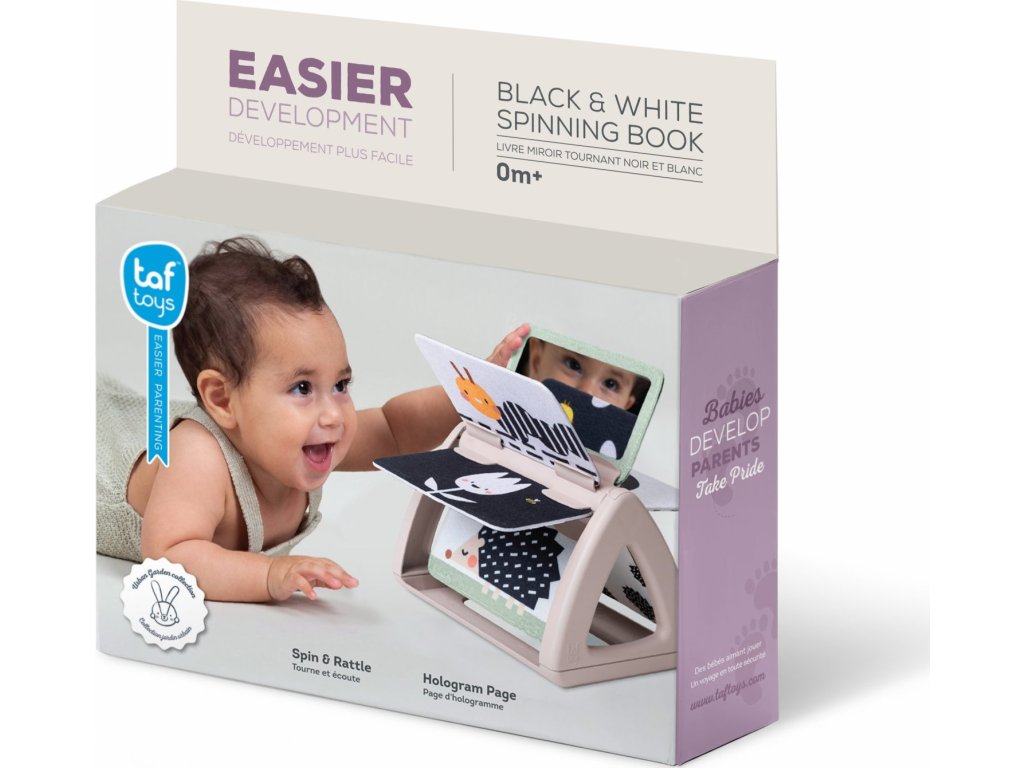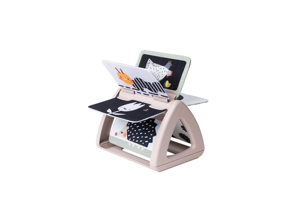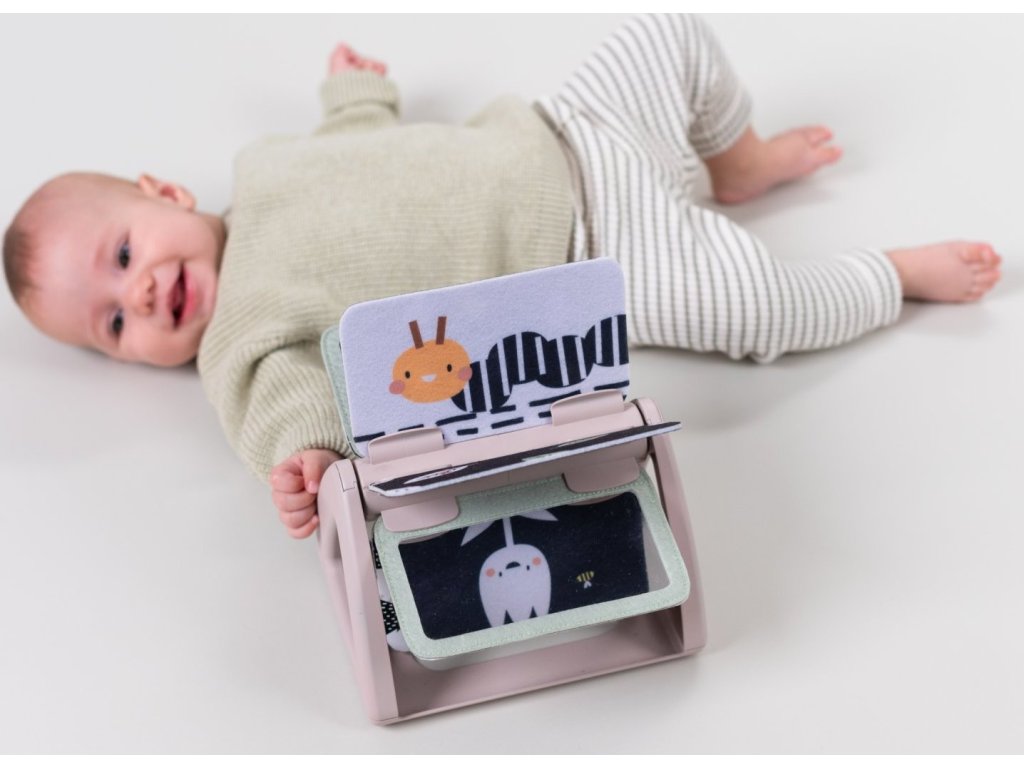 - Od 2 měsíců: výrazné obrázky, bezpečné zrcátko, hologramový třpytivý obrázek a chrasticí zvuk při otáčení jednotlivých stránek upoutají pozornost dítěte při hře na bříšku