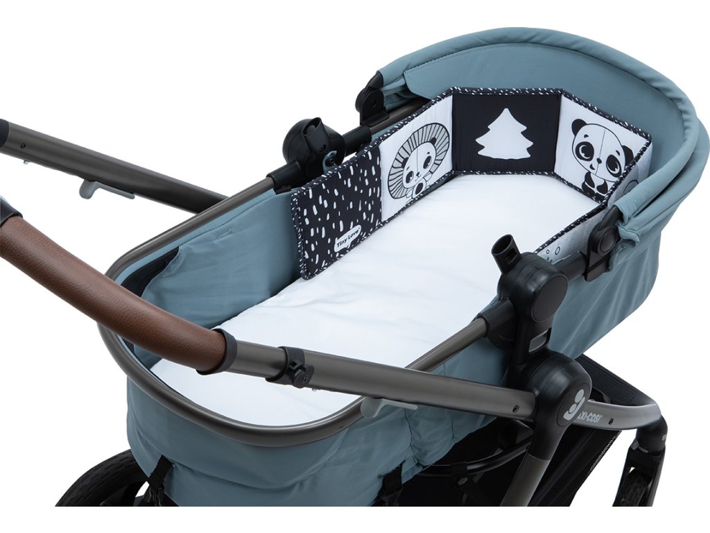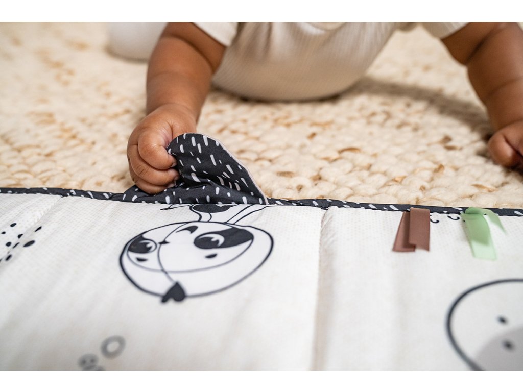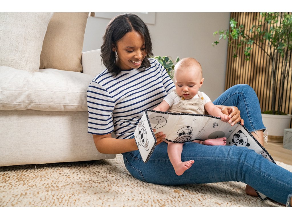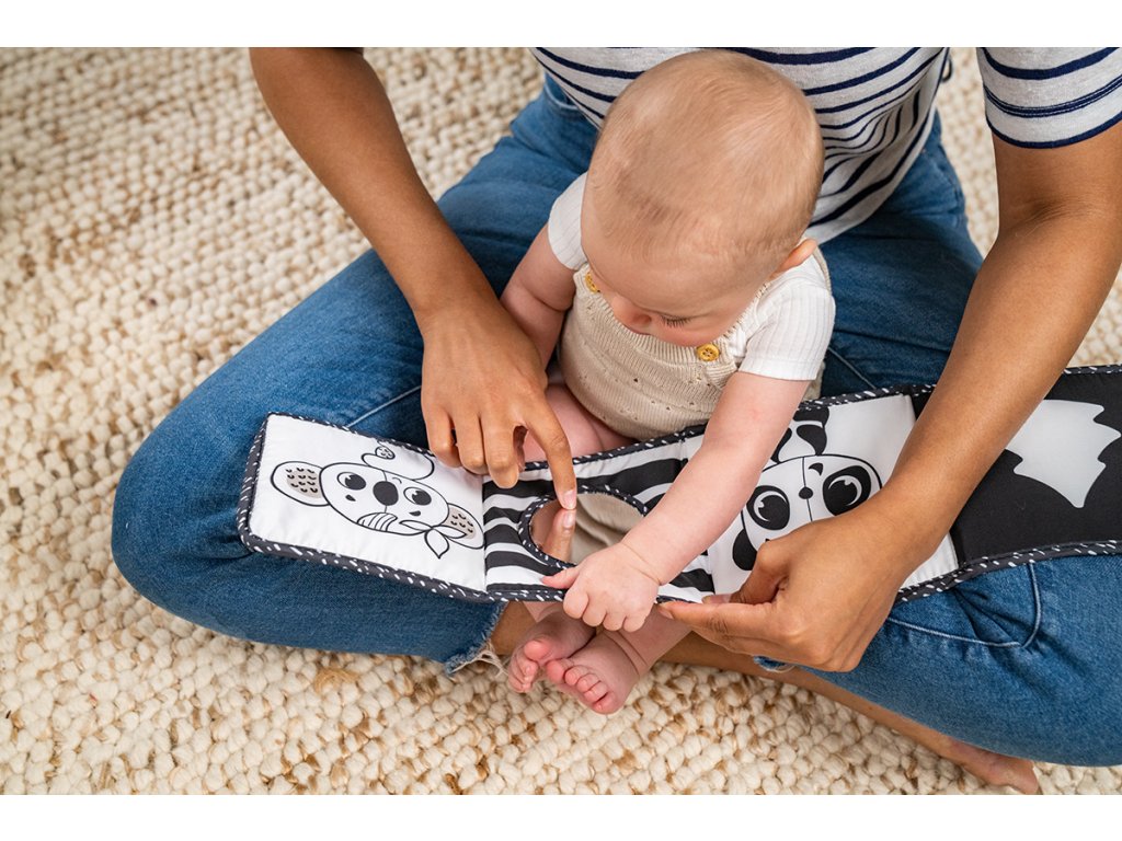 - 0-3 měsíce: strana s bezpečným zrcátkem a vysoce kontrastními, jednoduchými černo-bílými obrázky, které podněcují rozvoj smyslů a emoční inteligence dítěte.