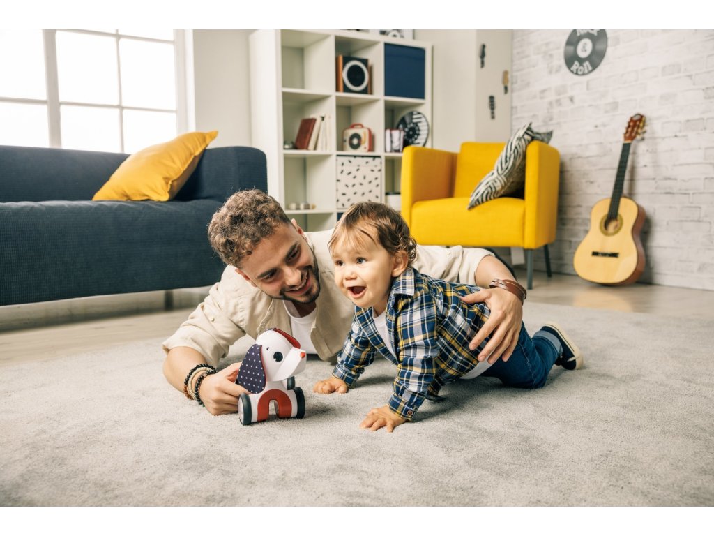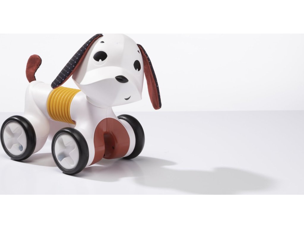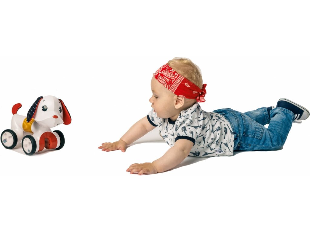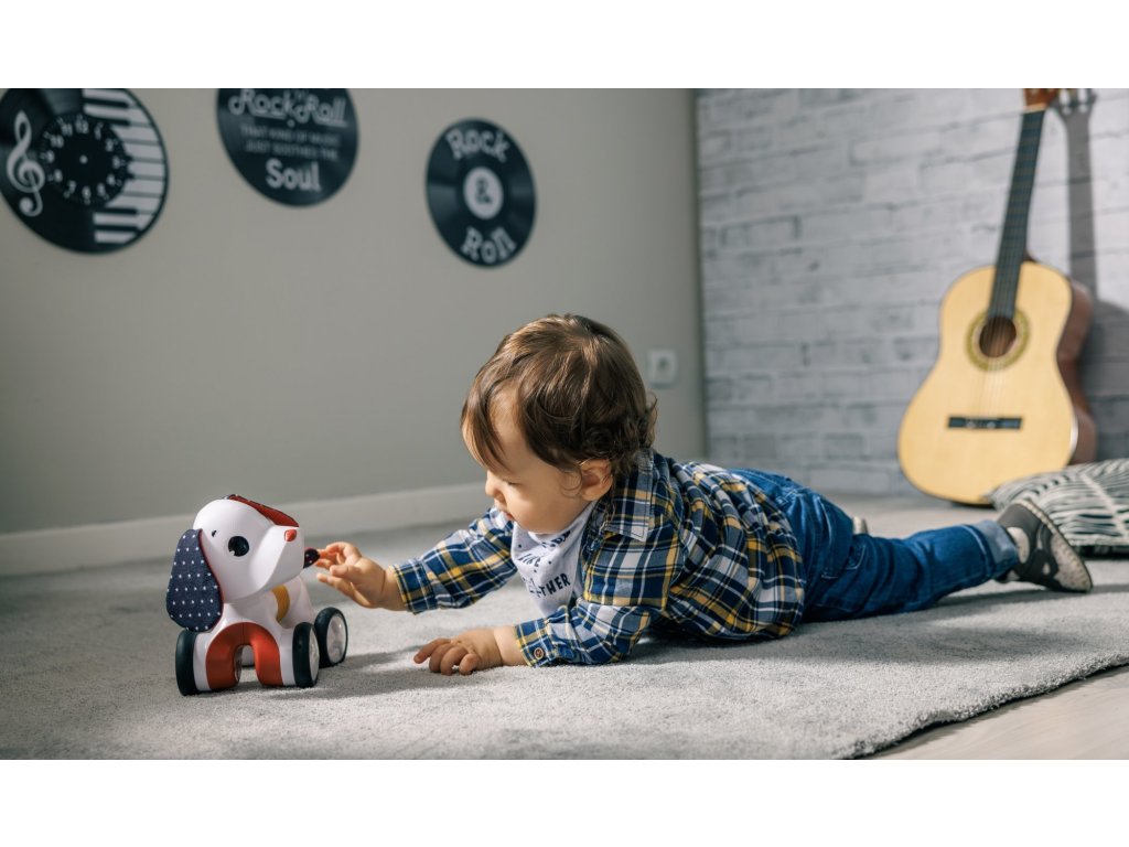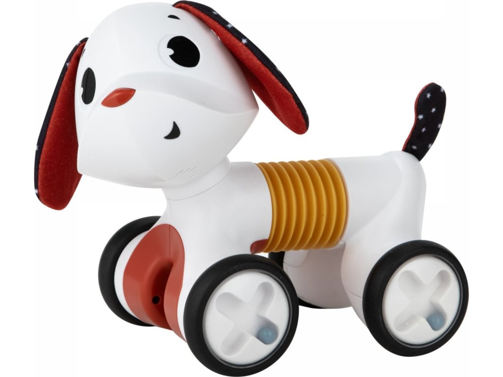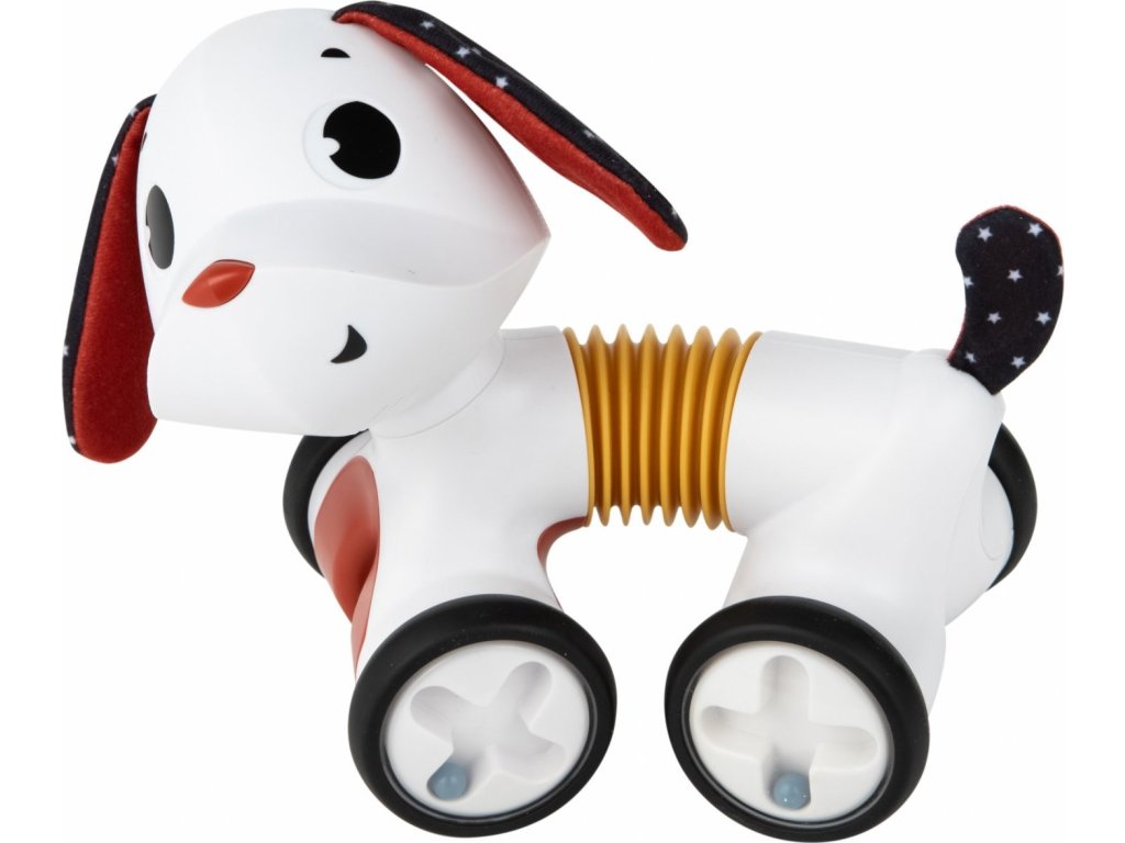 Roztomilá hudební hračka v podobě pejska s natahovacím harmonikovým tělem a kolečky zabaví dítě od hraní na bříšku přes lezení a samostatné sezení až po první krůčky. Stisknutím hlavy se pejsek rozjede, umí i štěkat a hrát 5 melodií. Díky ohebnému tělu umí sedět i při jízdě zatáčet. Jeho hlavou s šusticíma ušima je možné otáčet.