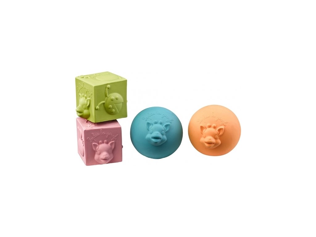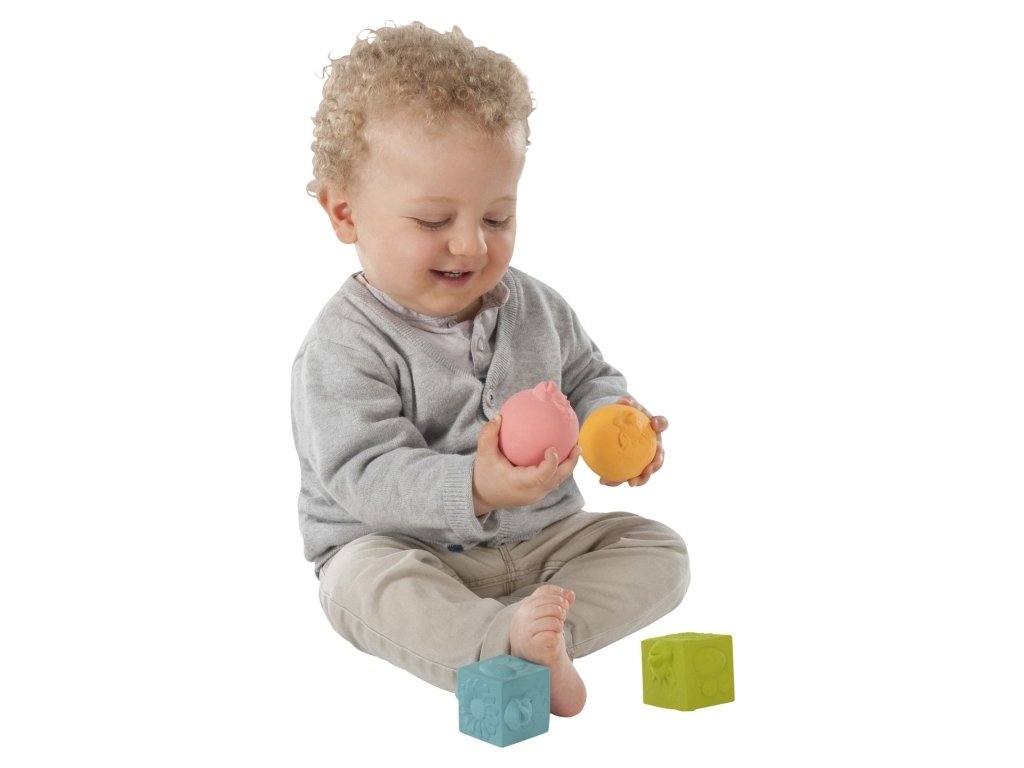 Při manipulaci s kostkami a míčky dítě rozvíjí své motorické schopnosti – jejich házením a chytáním. Dítě objevuje na každé kostce a míčku různý tvar obličeje zvířátek a jejich jasné barvy stimulují jeho zrak. Vyrobeny z 100% přírodního kaučuku, dítě je může bezpečně kousat. Jsou lehké a snadno se uchopují.