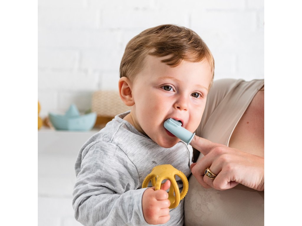 Prstový zubní kartáček je první zubní kartáček, který použijete pro své děťátko. Na jedné straně jsou pružné silikonové štětinky velmi šetrné k dásním a umožňují vám dobře vyčistit první zoubky a na druhé straně má kartáček drsný povrch, který umožňuje masírovat dásně a zmírnit nepohodlí při prořezávání zoubků Kartáček buduje a upevňuje návyky, aby si vaše dítě zvyklo čistit si zuby – činí z tohoto každodenního rituálu potěšení a zajišťuje dobrou hygienu a zdraví prvních zubů.Na štětinky můžete aplikovat přírodní zubní pastu nebo gel k úlevě od bolesti dásní při prořezávání zubů ■ V balení je set 2 kusů kartáčků spolu s pouzdrem, které chrání zubní kartáček před bakteriemi a umožňuje vám jej vzít všude s sebou.
