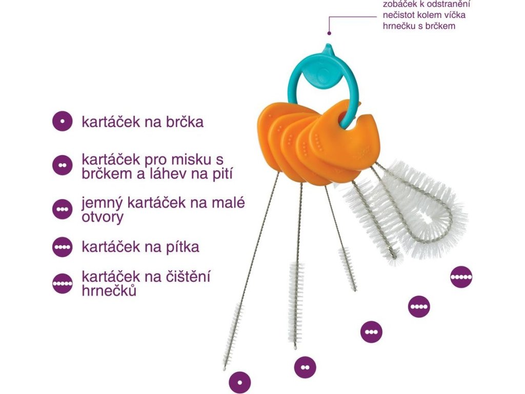 Tato sada kartáčků obsahuje všechny kartáčky, které potřebujete k čištění hrnečku s brčkem, lahví a termosek na pití. Kartáčky jsou na jednom kroužku. Kartáčky lze z kroužku sejmout a po použití jednoduše přicvaknout zpět.