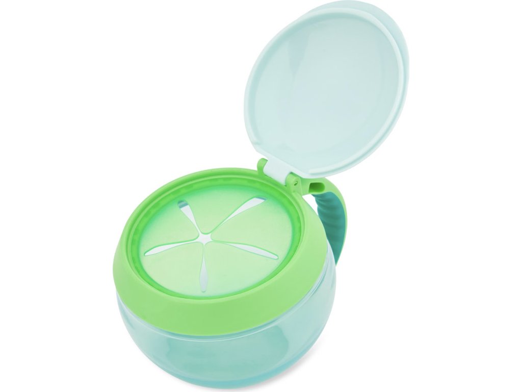 Šikovný nápad na cesty. Nádoba má víčko, které po otevření drží, před vysypáním obsahu jej chrání pružné lamely, které pustí dětskou ručičku dovnitř, ale nepustí svačinu ven. Nádoba je průhledná, aby se mohla brzy doplnit. Na boku je praktické ouško v dětském rozměru, pomocí kterého lze nádobu připevnit i na kočárek či tašku. 0% BPA, 0% PVC, bez ftalátů. Obsah: 222 ml. Průměr: 10 cm