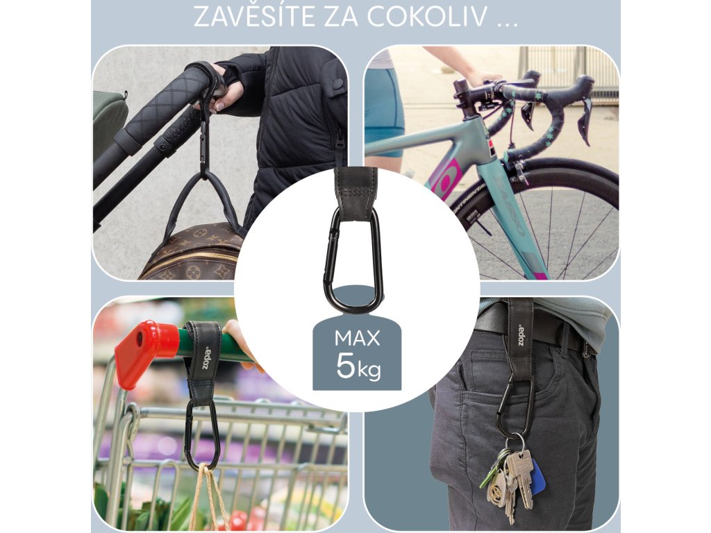 Usnadněte si každodenní pochůzky s multifunkčním popruhem se skobou Deluxe! Díky snadné instalaci pomocí suchého zipu pevně připevní přebalovací tašku, kabelku nebo nákupní tašku na rukojeť kočárku. Robustní kovová skoba bez problémů unese i těžší předměty, a univerzální design zajistí kompatibilitu se všemi typy kočárků i nákupních vozíků.