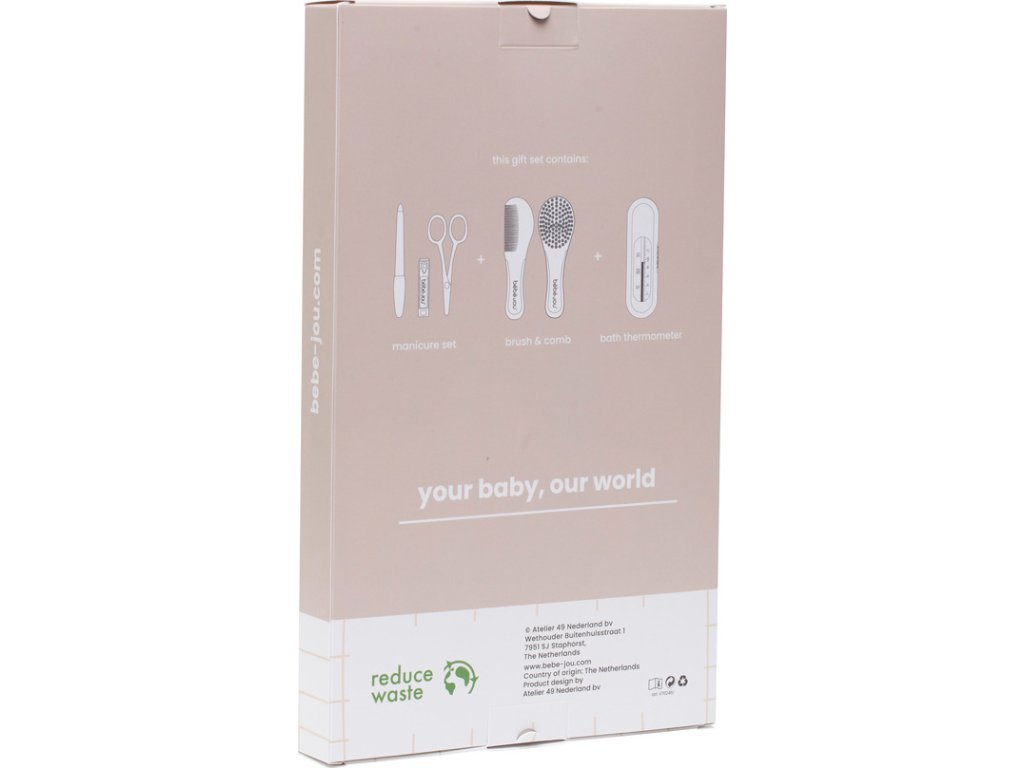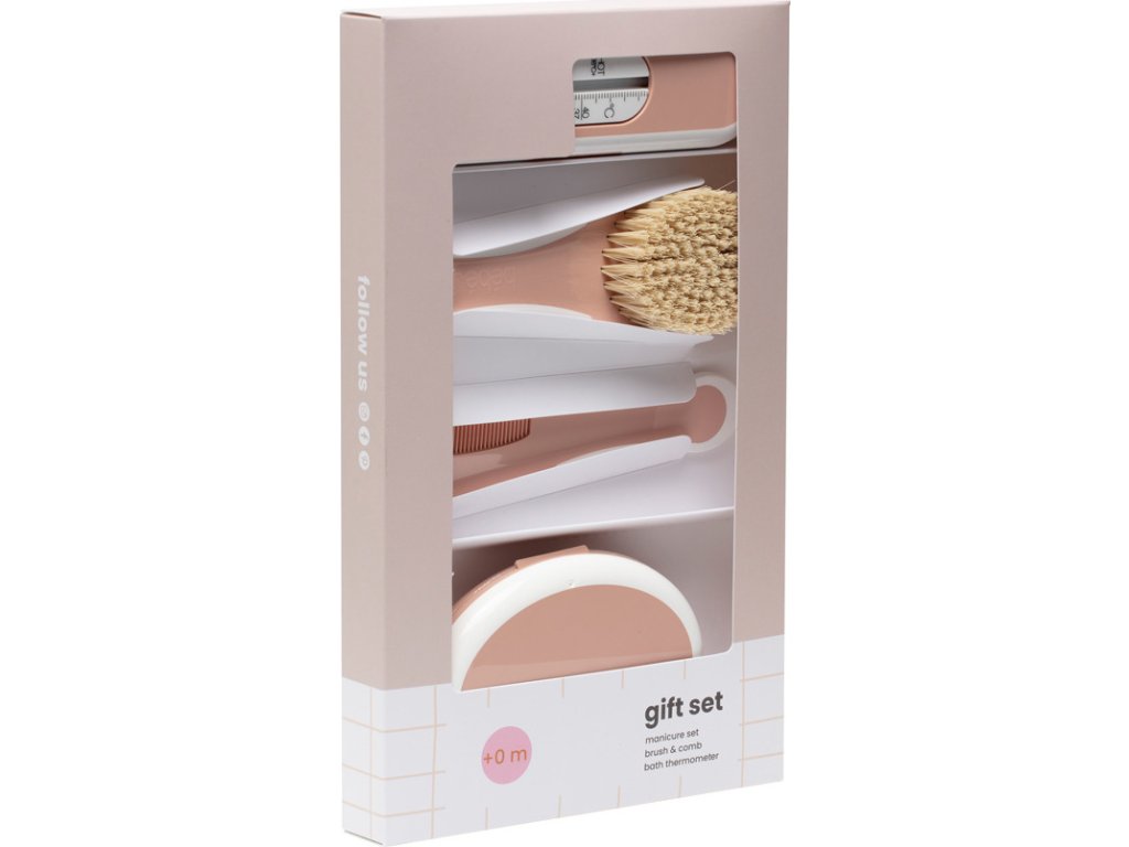 Roztomilá čtyřdílná dárková sada potěší novopečené rodiče hned několikrát. Poprvé, když ji obdrží a pak pokaždé, když ji budou používat. Není to jenom krásný dárek, ale také velice praktická, krásně zabalená sada. Obsahuje koupací teploměr, manikůru, hřeben a kartáč.