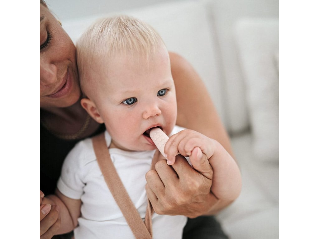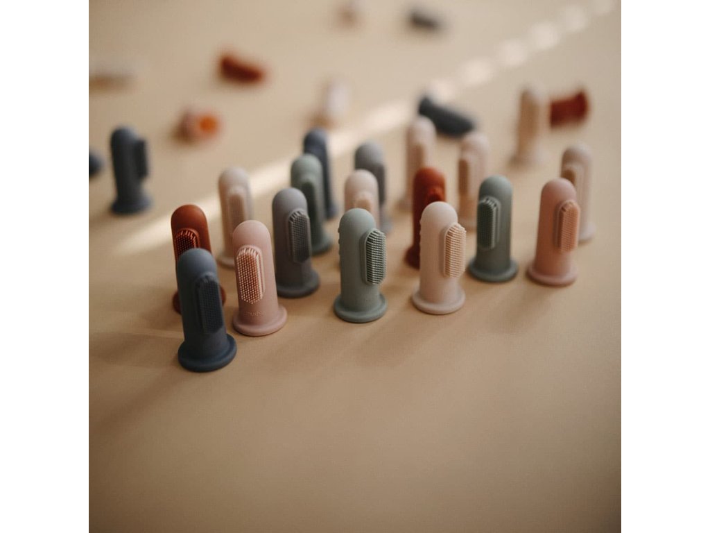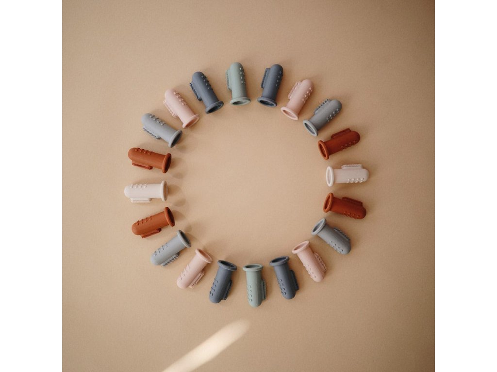 - Mushie silikonový zubní kartáček na prst v jemných pastelových barvách
